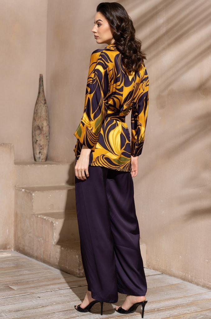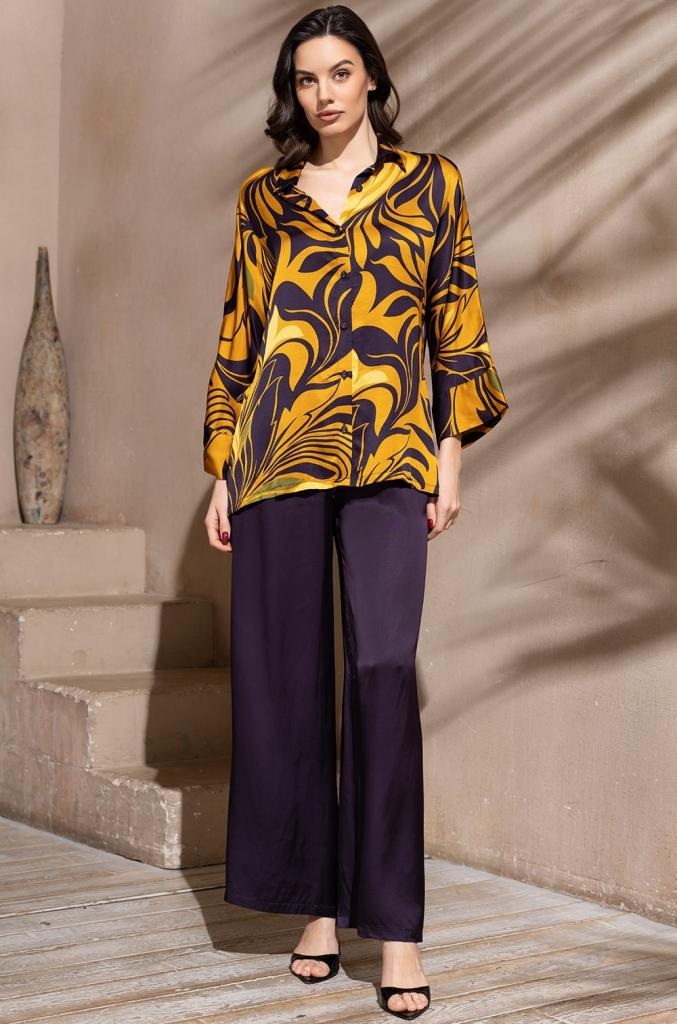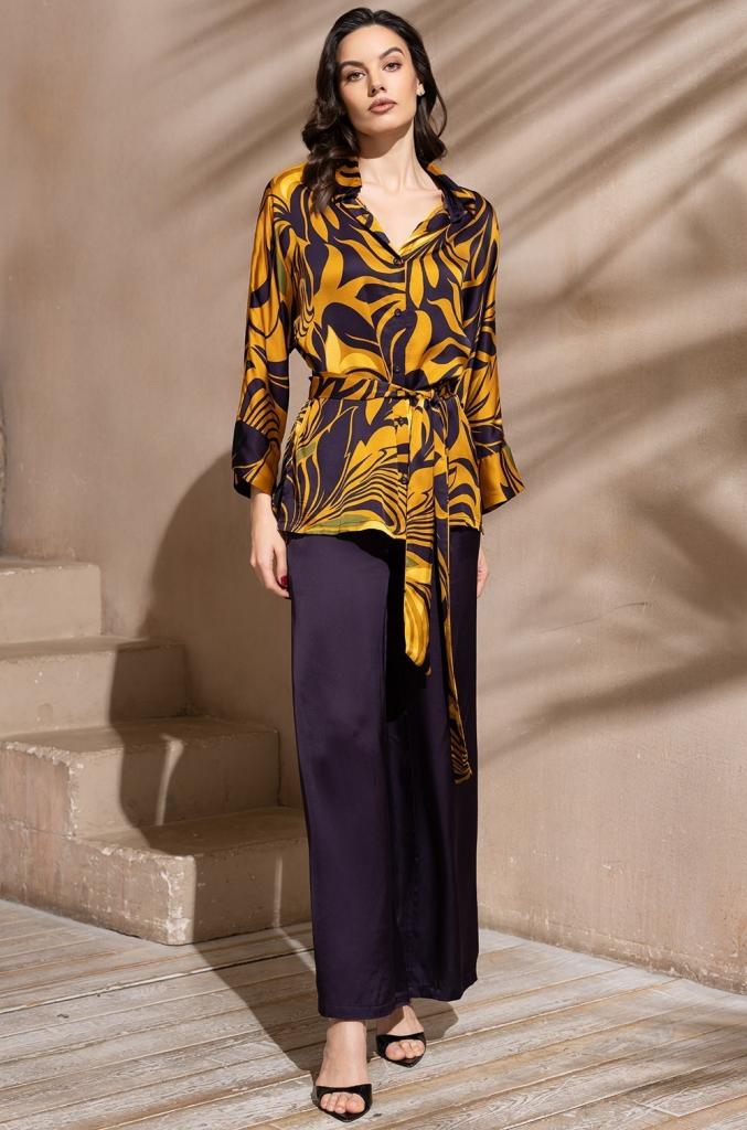 Комплект Mia-Amore состоит из рубашки свободного силуэта с длинным рукавом и свободных брюк. Рубашка выполнена из принтованного смесового шелка, а брюки из однотонного. Линию талии можно подчеркнуть за счет пояса, который идет в комплекте.