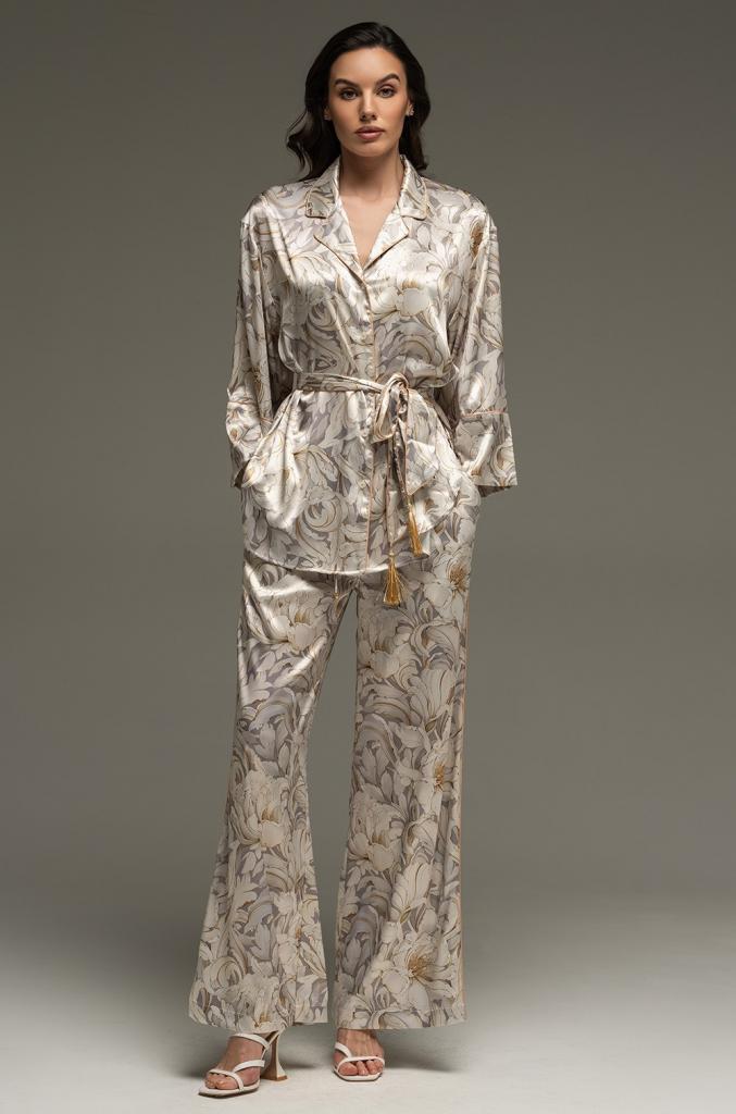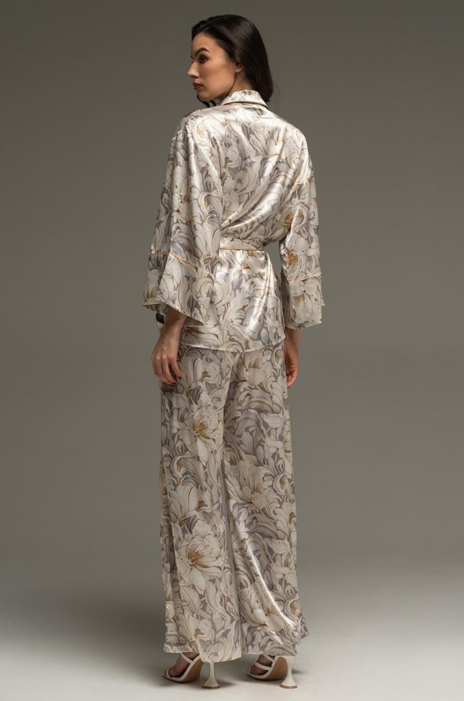 Комплект Mia-Amore выполнен из принтованного смесового шёлка, состоит из жакета на пуговицах и брюк-палаццо. Воротник, манжеты, пояс и брюки украшены тонким золотым кантом. Широкий пояс жакета украшен золотыми кисточками. В боковых швах брюк есть карманы.