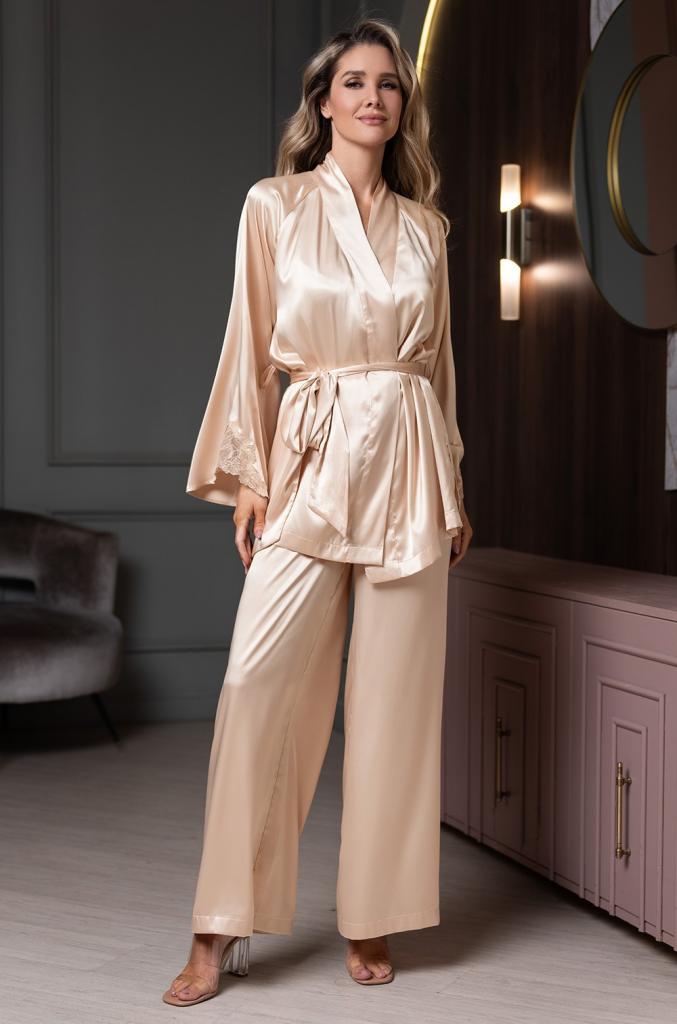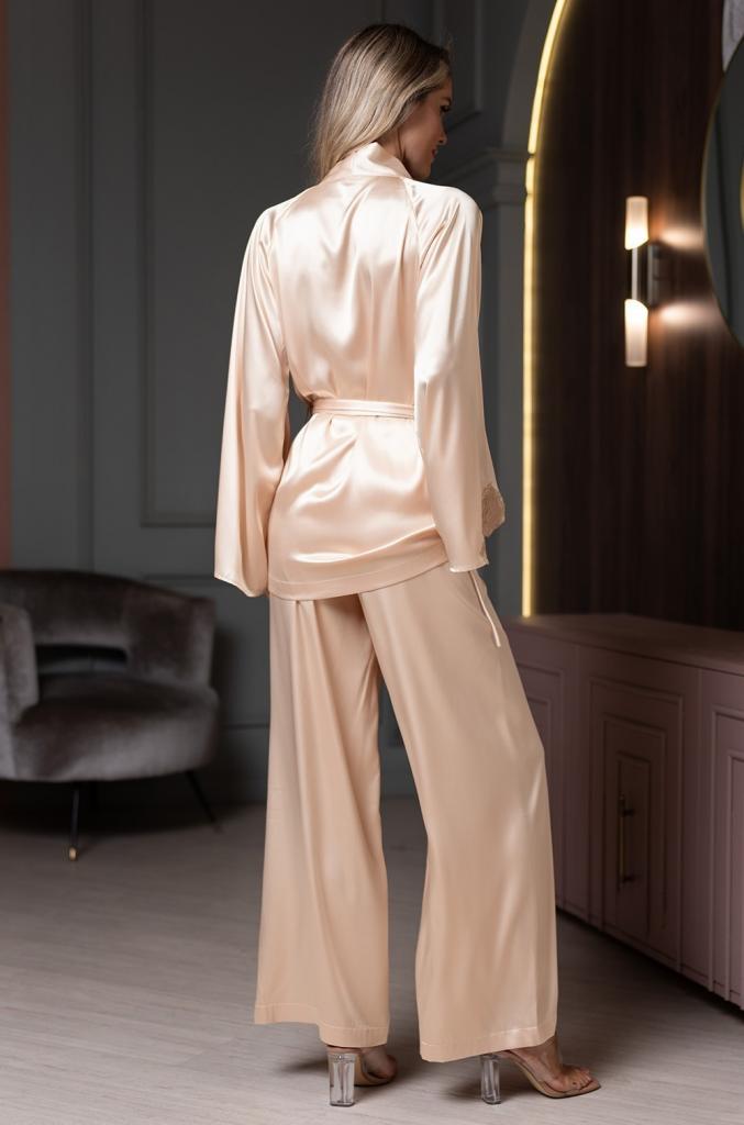 Комплект Mia-Amore выполнен из однотонного смесового шёлка, состоит из запашного жакета и брюк. Широкие брюки с эластичным поясом и карманами в боковых швах. По низу рукава жакета украшены ажурными вставками из вышитого кружева. Жакет запахивается с помощью широкого съёмного пояса.