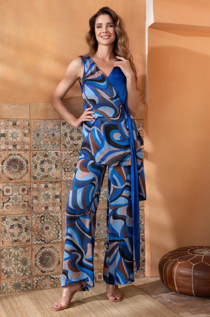 Комплект Mia-Amore состоит из удлиненного запашного топа на широких бретелях и свободных брюк-палаццо. Топ выполнен из сочетания принтованного и смесового шелка, а брюки полностью принтованные.