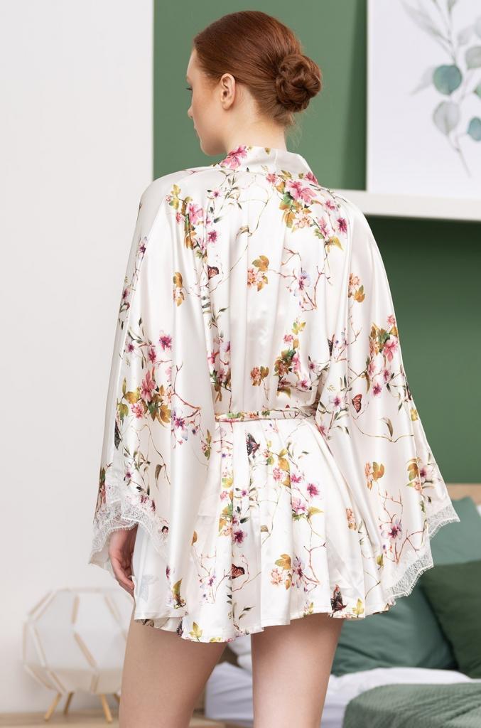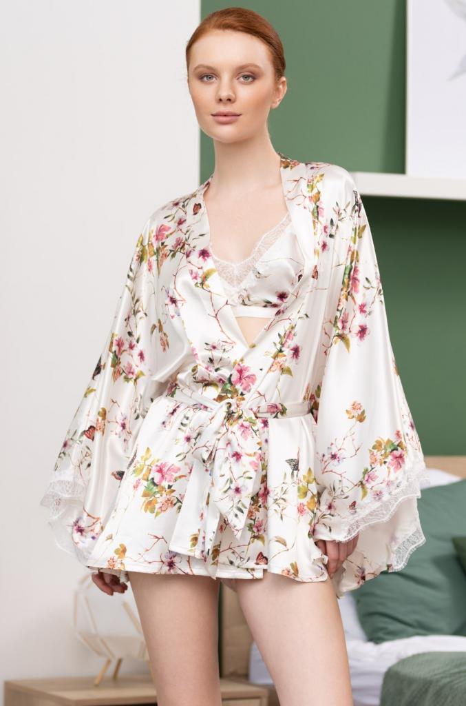 Комплект-тройка Mia-Amore состоит из кроп-топа, коротких шорт и короткого халатика. Комплект выполнен из принтованного смесового шёлка. Лиф топа украшен кружевом и бантиком, по бокам укороченных шорт глубокие разрезы. Запашной жакет с длинными рукавами, отделанными по низу кружевом. Жакет комплектуется широким поясом.