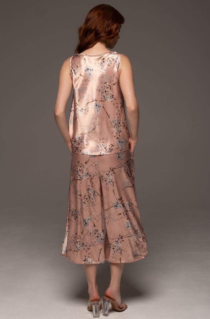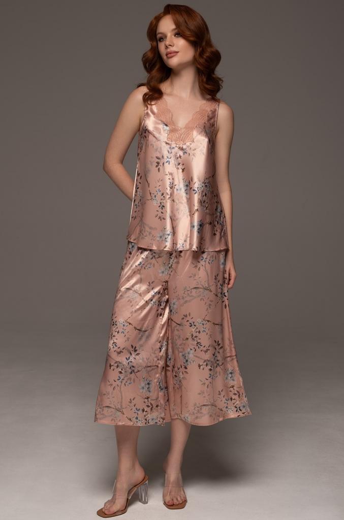 Комплект Mia-Amore состоит из топа и укороченных расклешённых брюк, выполнен из принтованного смесового шёлка. Топ с широкими бретелями, горловина украшена изящным вышивным кружевом.
