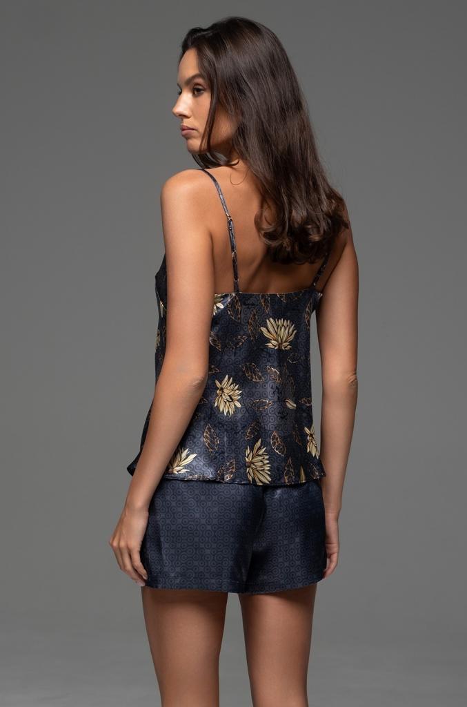 Комплект Mia-Amore состоит из топа на тонких бретелях и шорт, выполнен из принтованного смесового шелка. В боковых швах шорт присутствуют карманы.