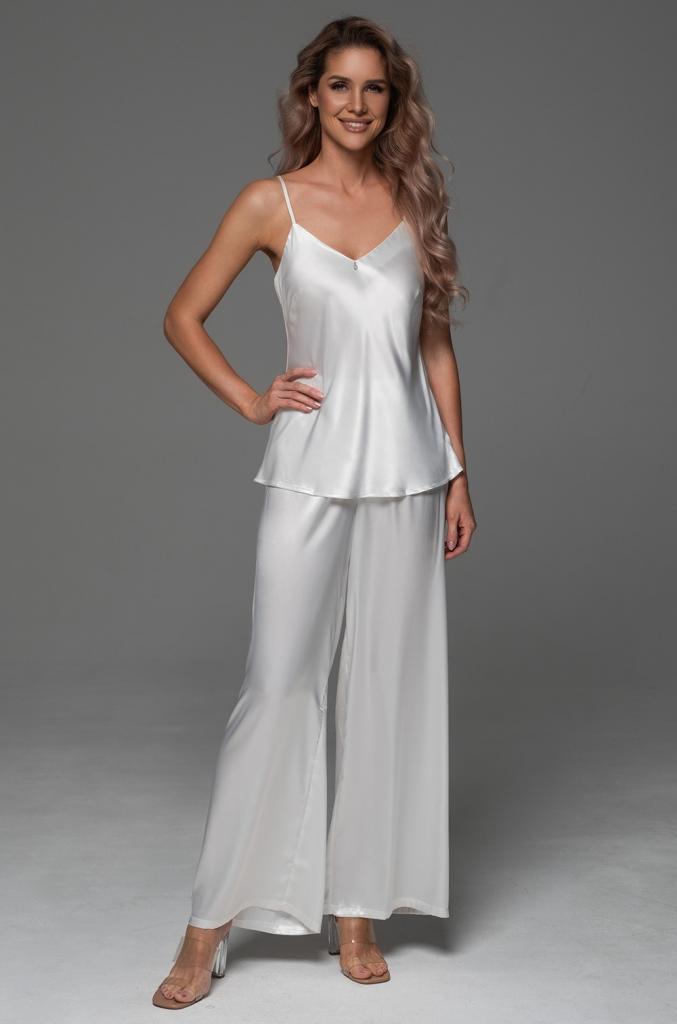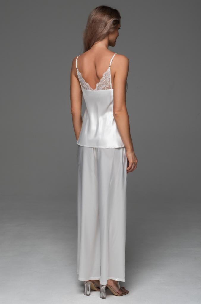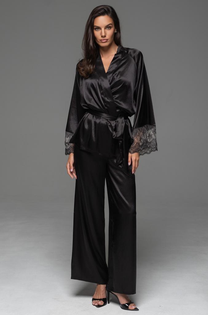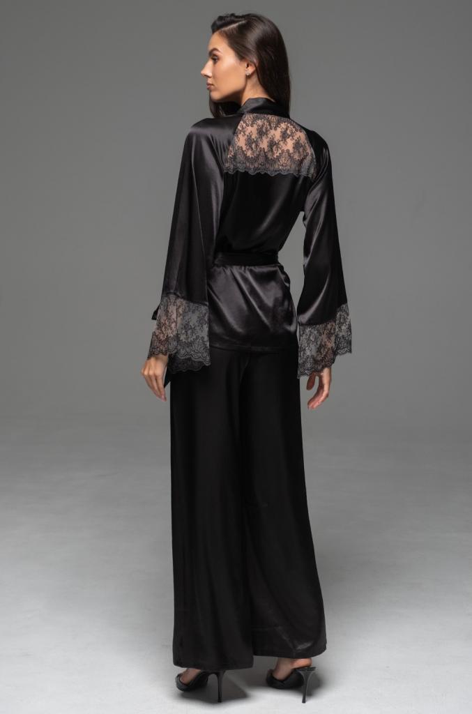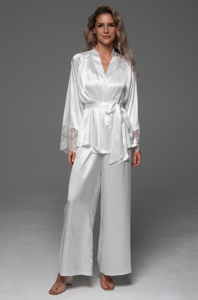 Комплект-тройка Mia-Amore выполнен из однотонного смесового шёлка, состоит из запашного короткого жакета, топа на тонких бретелях и брюк. Бретели топа на спинке украшены вставками из кружева, широкие брюки с эластичным поясом, рукава халата декорированы по низу кружевом. Жакет запахивается с помощью широкого съёмного пояса.
