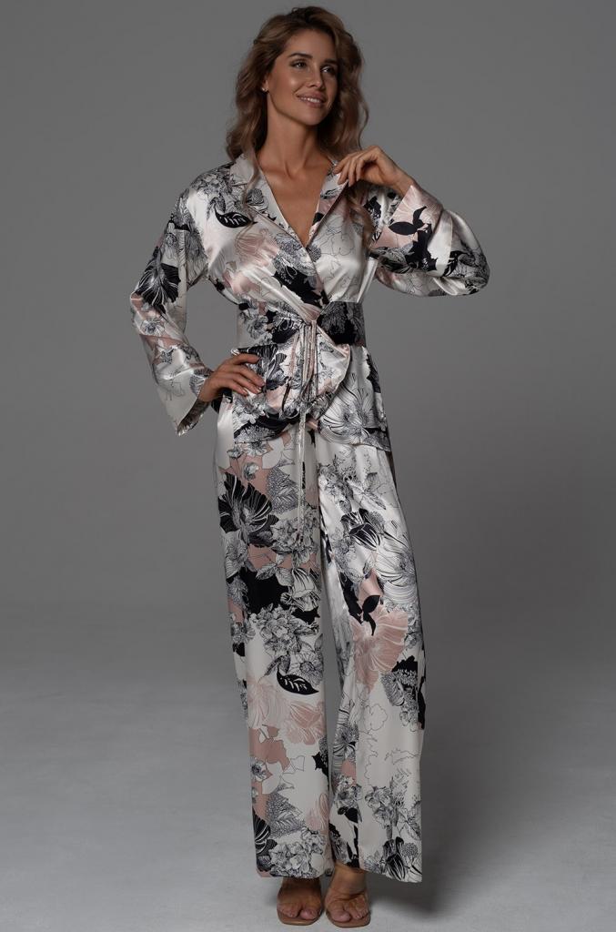 Женственный комплект Mia-Amore, который состоит из жакета с фигурной линией низа, длинным рукавом и широких брюк. Изделия выполнены из принтованного смесового шелка. Линию талии можно подчеркнуть за счет широкого пояса с завязками, который идет в комплекте.