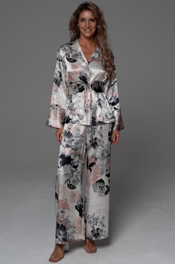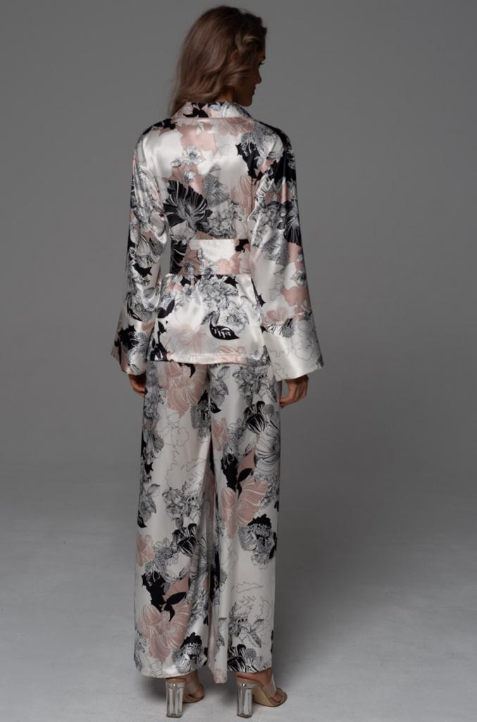 Классический комплект Mia-Amore состоит из жакета с длинным рукавом и широких брюк. Изделия выполнены из принтованного смесового шелка с отделкой в виде контрастного канта по бортам и линии притачивания манжет. Линию талии можно подчеркнуть за счет широкого пояса с завязками, который идет в комплекте.