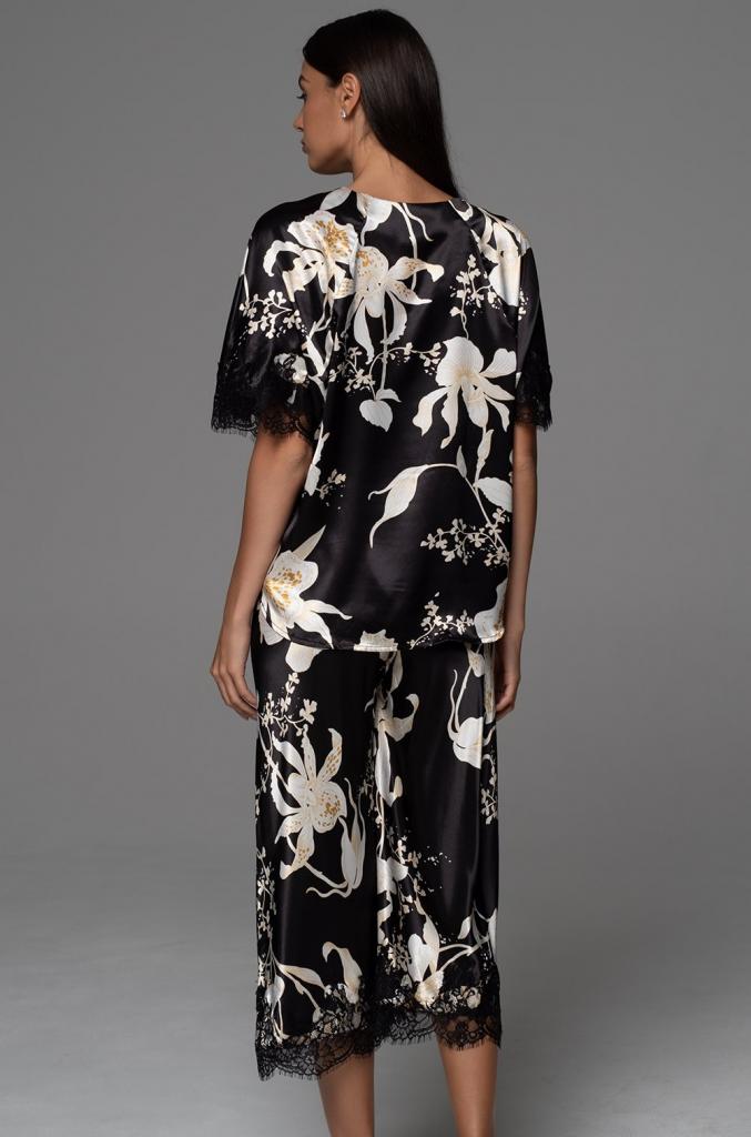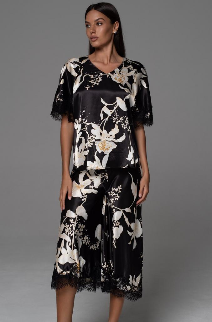 Комплект Mia-Amore состоит из блузки со спущенным плечом и укороченных расклешённых брюк, выполнен из принтованного смесового шёлка. Рукава блузки и низ брюк украшены изящным широким кружевом. По центру блузки лифа бантик.