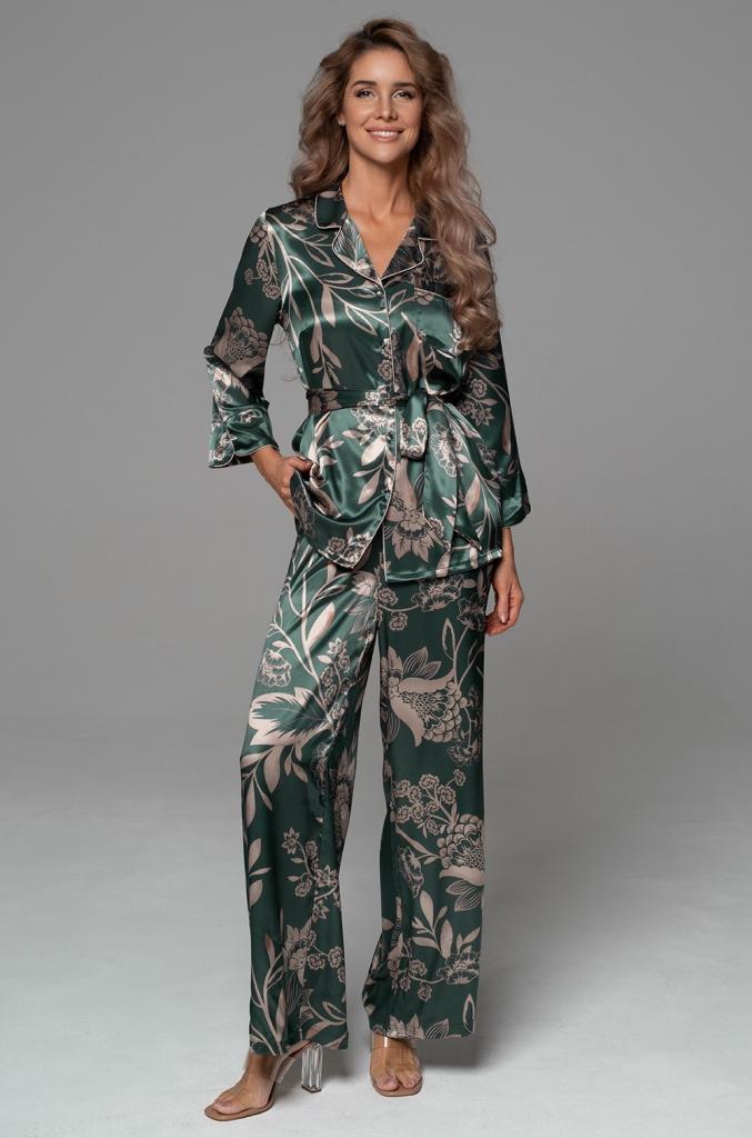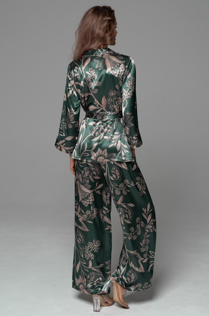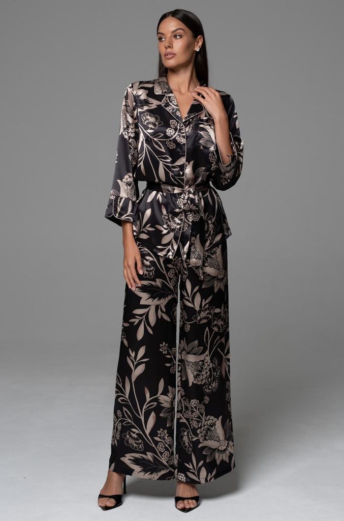Брючный комплект Mia-Amore из принтованного смесового шелкового полотна, состоит из жакета с рукавами ¾ и брюк. Жакет на пуговицах, с накладным нагрудным карманом. Отложной воротник и фигурные широкие притачные манжеты украшены тонкими кантами в цвет рисунка. Брюки длинные, с карманами в боковых швах. Комплект дополнен поясом.