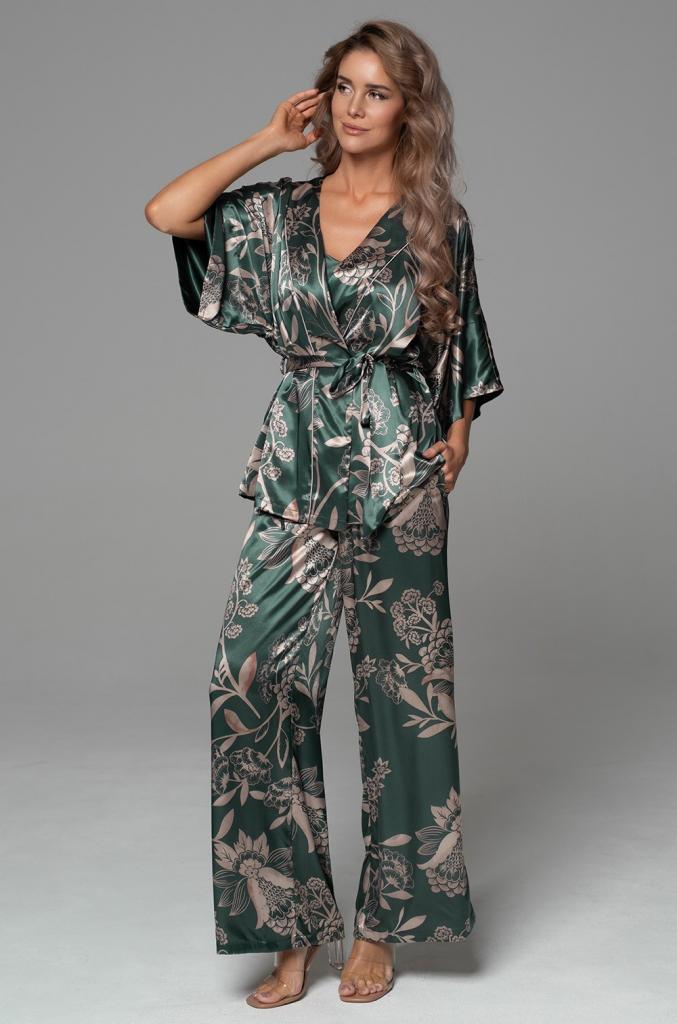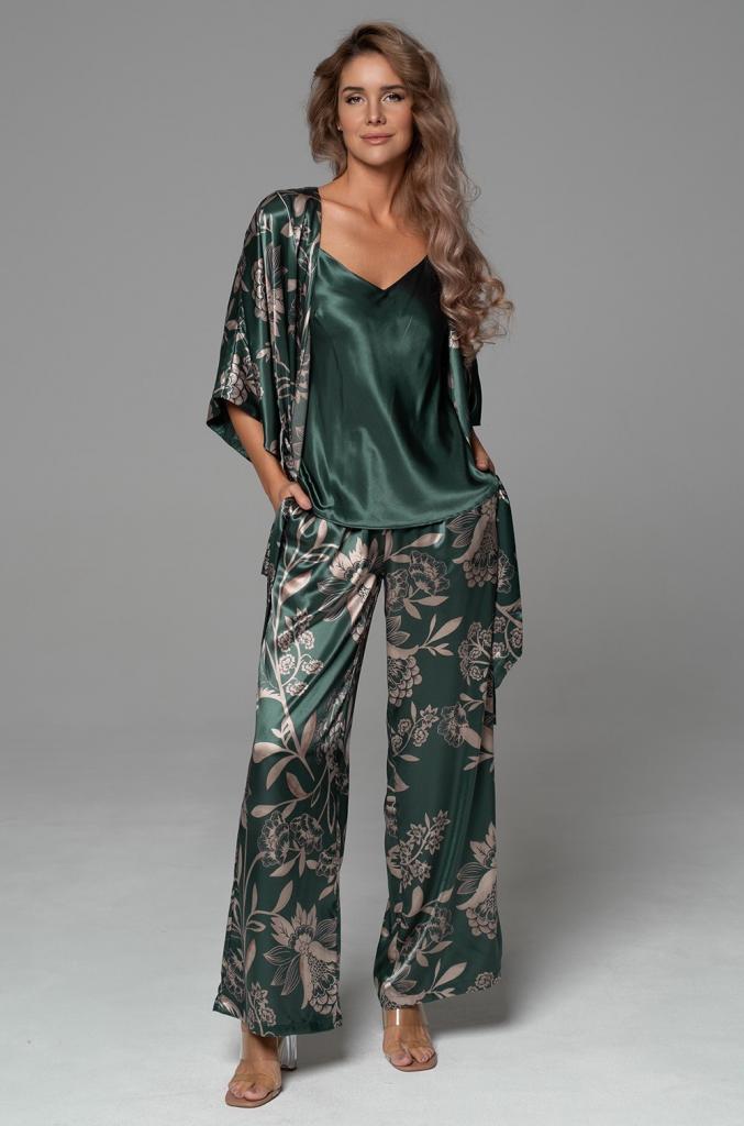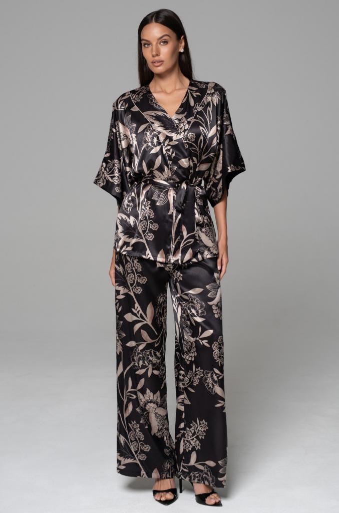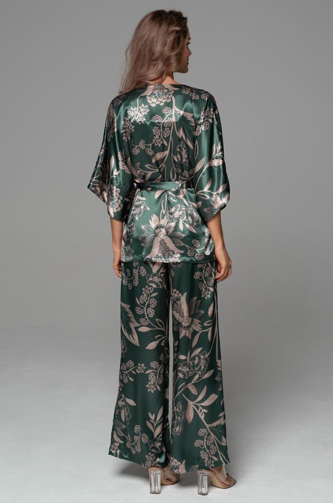 Комплект-тройка Mia-Amore состоит из запашного жакета, широких брюк и топа. Брюки и жакет выполнены из принтованного смесового шелка, а топ - из однотонного. Линия талии подчеркнута за счет широкого пояса, который идет в комплекте.