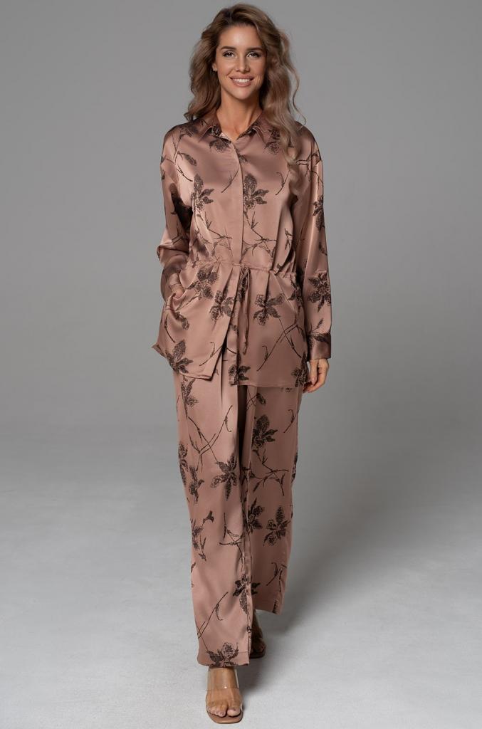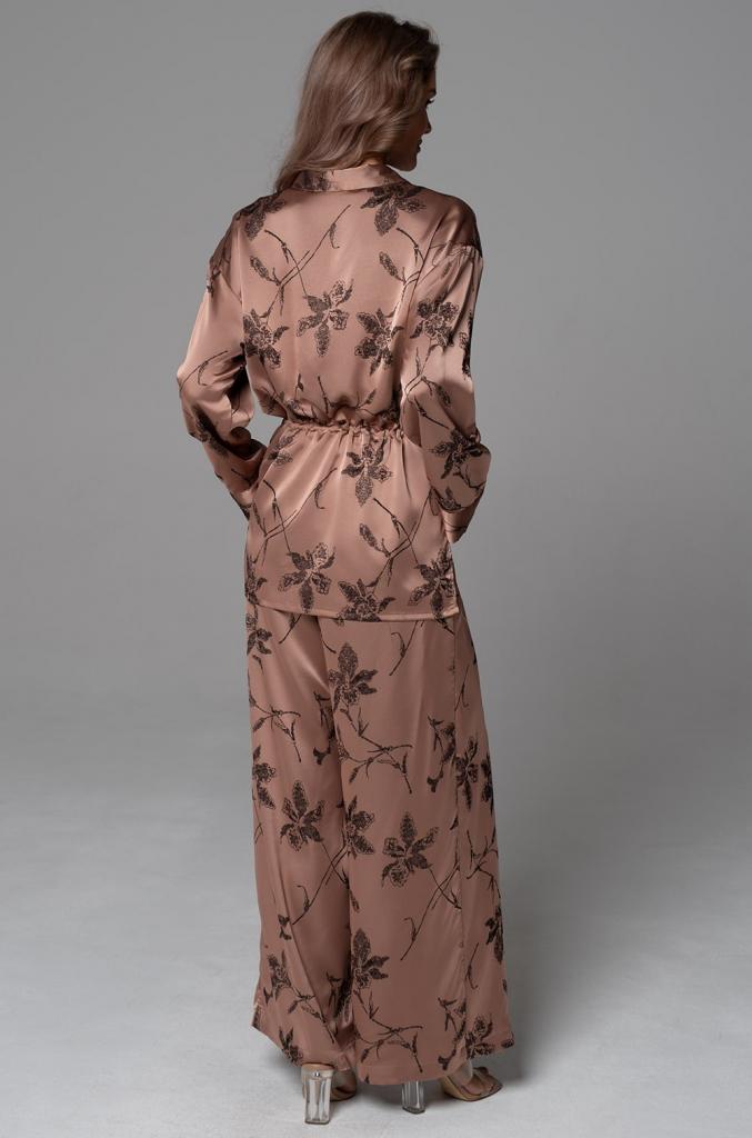 Комплект Mia-Amore состоит из рубашки с центральной потайной застёжкой на пуговицы и длинными рукавами, и брюк. Комплект выполнен из жаккардового двухцветного смесового шёлка. На рубашке утягивающая кулиса по талии. Широкие брюки с эластичным поясом и с боковыми карманами.