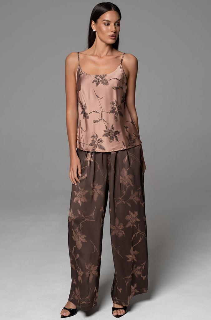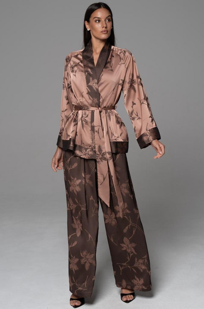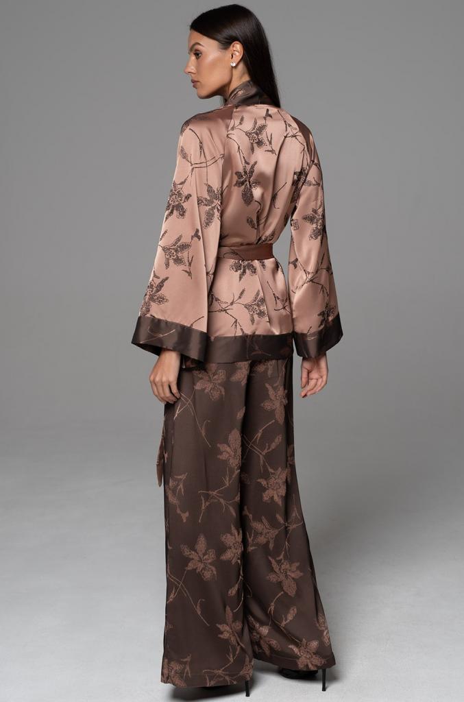 Комплект-тройка Mia-Amore состоит из топа, брюк и запашного жакета. Брюки выполнены из темного компаньона смесового шёлка. Жакет на тонких бретелях из светлой стороны жаккардового шёлка. Планка и манжеты жакета выполнены из тёмного компаньона. Брюки с эластичным поясом и с боковыми карманами. Жакет комплектуется широким поясом.