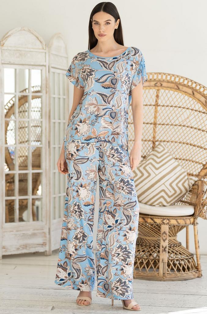 Комплект Mia-Amore состоит из топа с коротким рукавом и широких брюк, выполнен из тканой принтованной вискозы. Ажурная хлопковая тесьма расположена по линии плеч топа. По бокам брюк обработаны карманы.