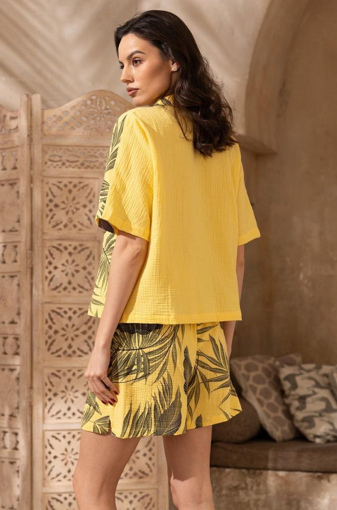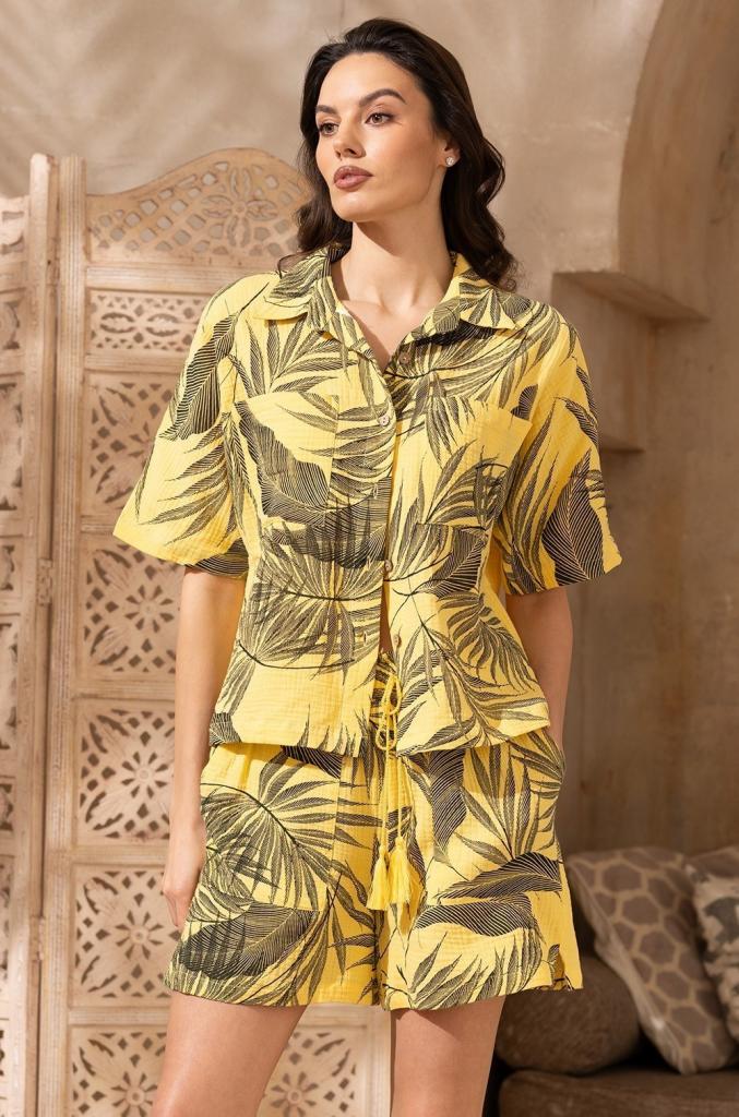Комплект Mia-Amore состоит из жакета свободного силуэта с коротким рукавом и шорт. Жакет выполнен из комбинации принтованного и однотонного муслина, а шорты полностью из принтованного. По бокам шорт обработаны карманы.