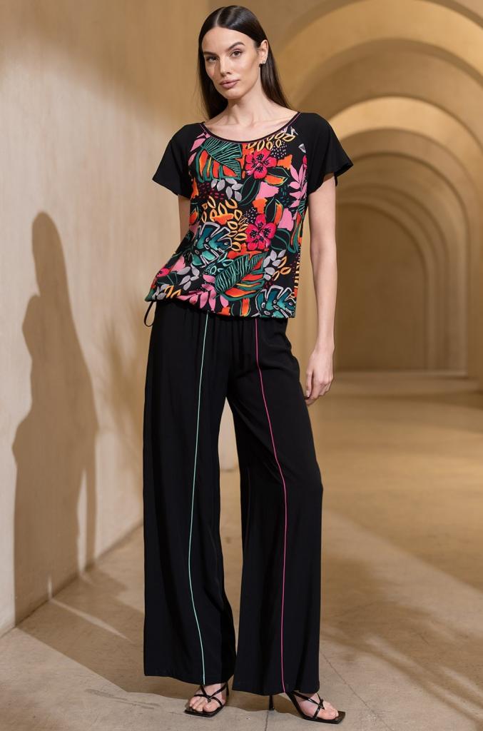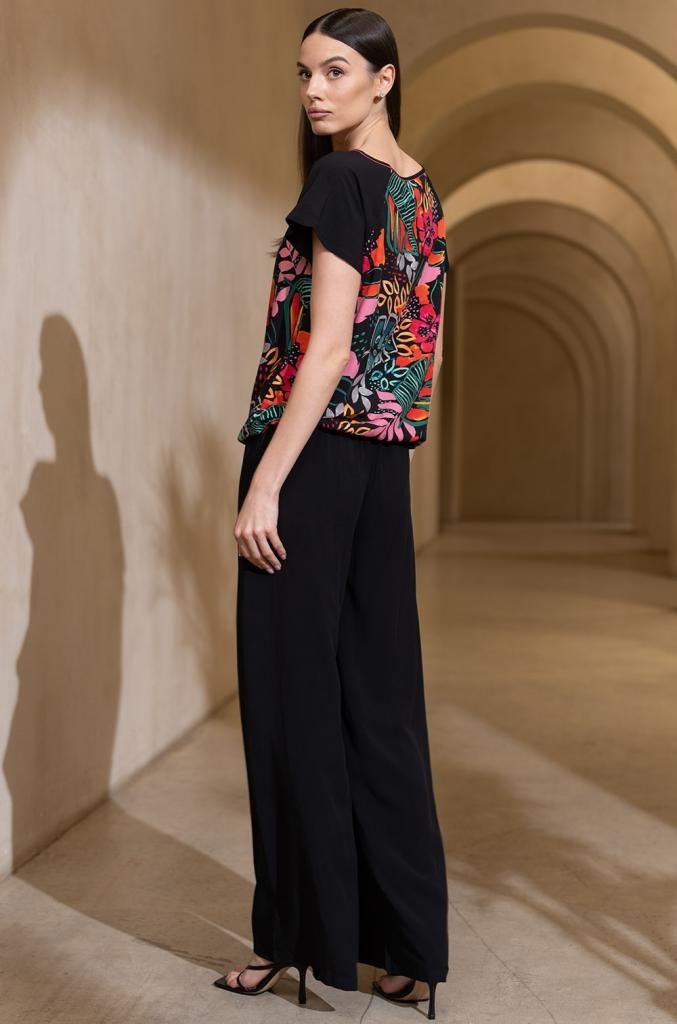 Комплект Mia-Amore состоит из топа с коротким рукавом и свободных брюк. Изделия комплекта выполнены из комбинации принтованной и однотонной тканой вискозы с контрастными кантами в виде отделки.