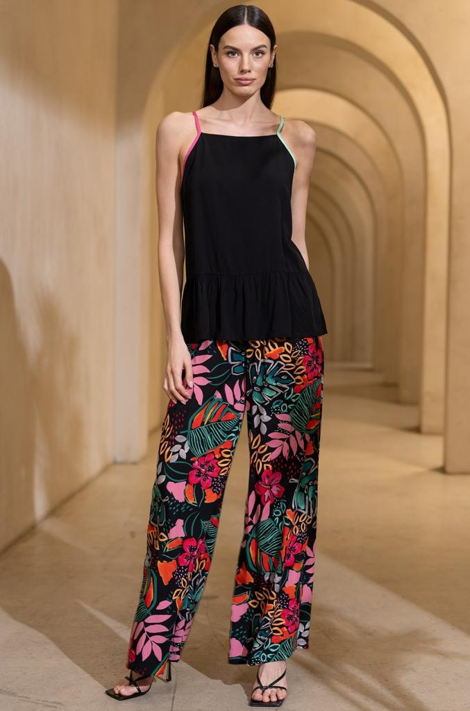 Комплект Mia-Amore состоит из однотонного топа на тонких бретелях с оборкой по низу и свободных принтованных брюк. Изделия комплекта выполнены тканой вискозы с контрастными кантами в виде отделки.