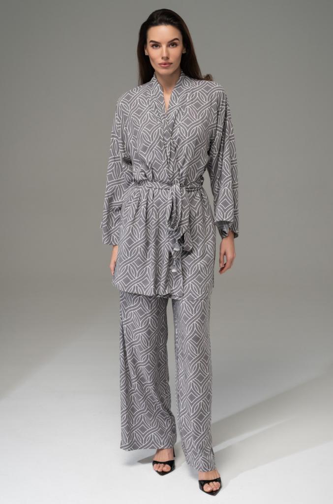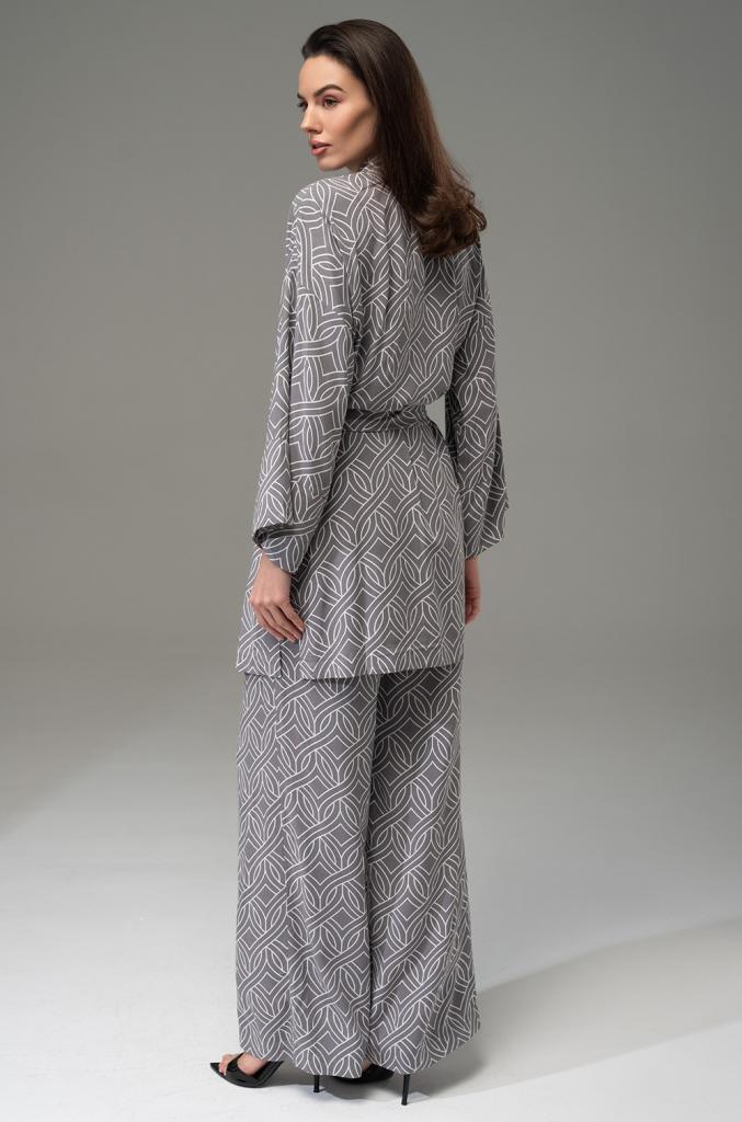 Комплект Mia-Amore состоит из удлинённого запашного жакета с длинными рукавами и брюк-палаццо силуэта, выполнен из принтованного вискозного полотна. Жакет комплектуется поясом. Пояс украшен декоративными кисточками. Брюки на эластичном поясе с боковыми карманами.