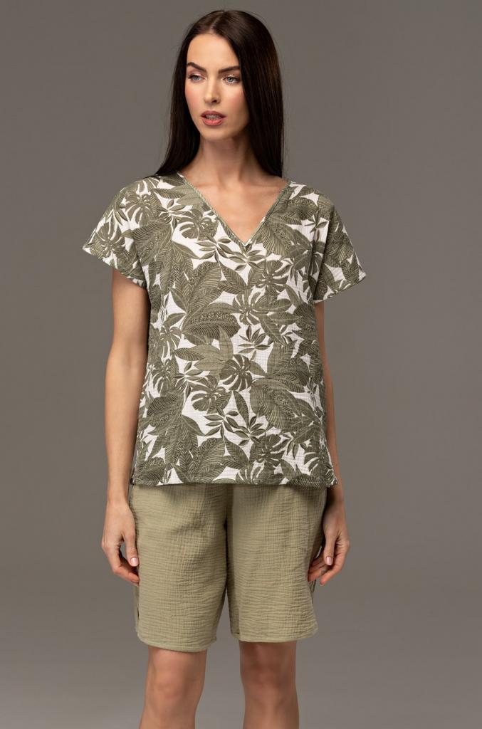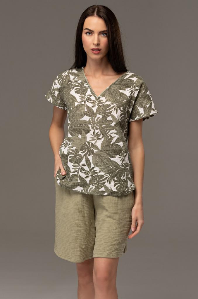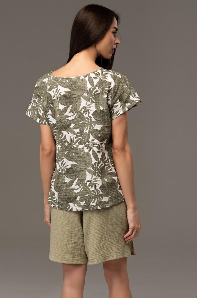 Комплект Mia-Amore состоит из топа свободного силуэта с коротким рукавом и удлиненных шорт, топ выполнен из принтованного хлопкового муслина, а шорты – из однотонного. Шорты с широким эластичным поясом. По бокам расположены карманы.