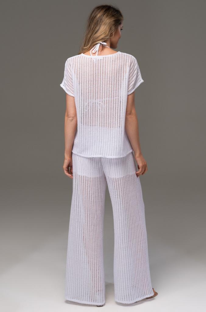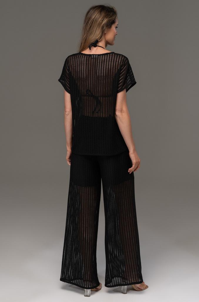 Комплект Mia-Amore состоит из топа свободного силуэта с коротким рукавом и округлым вырезом горловины, и широких брюк. В верней части брюк выполнена подкладка из однотонного хлопка. Изделие выполнено из хлопкового сетчатого полотна.