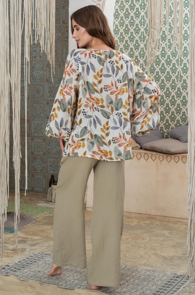 Комплект Mia-Amore состоит из блузы свободного силуэта с длинным пышным рукавом и широких брюк. Блуза выполнена из принтованного хлопкового муслина, а брюки из однотонного.