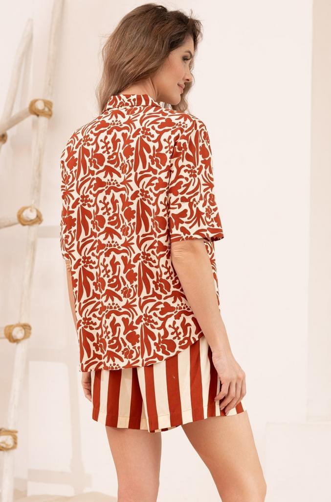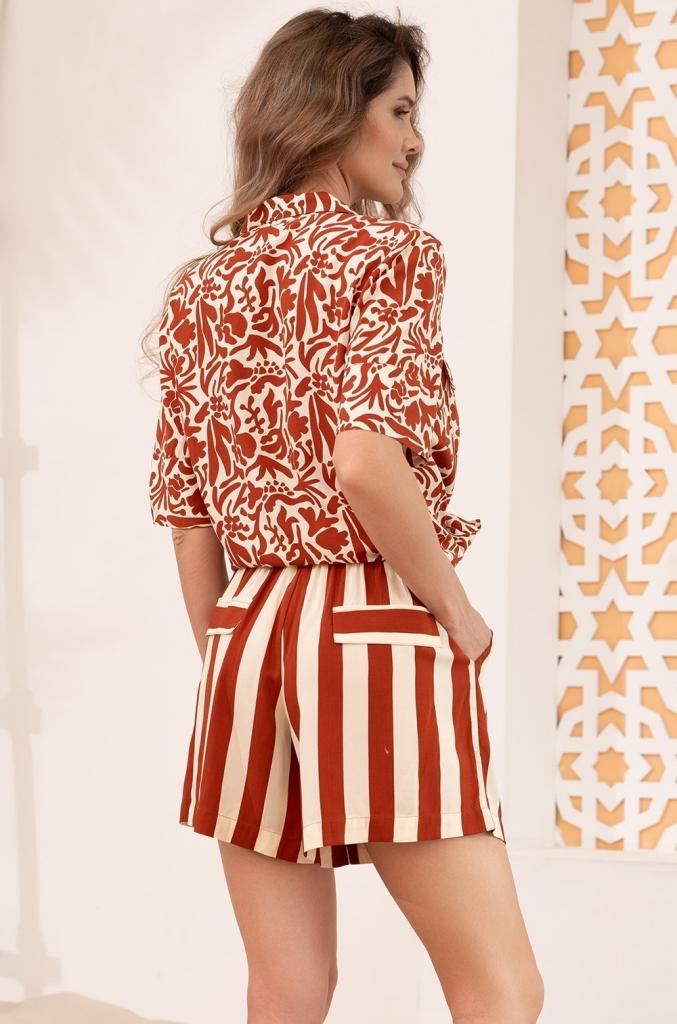 Комплект Mia-Amore состоит из жакета с коротким рукавом и шорт, выполнен из тканой принтованной вискозы: жакет с использованием основного принта, а шорты из принта-компаньона в полоску. Жакет с застежкой, на верхней части полочек жакета расположены накладные карманы с клапанами. По бокам шорт обработаны карманы.