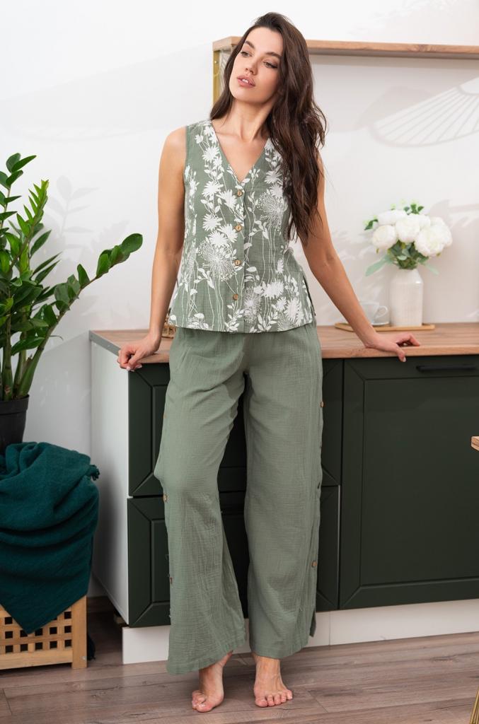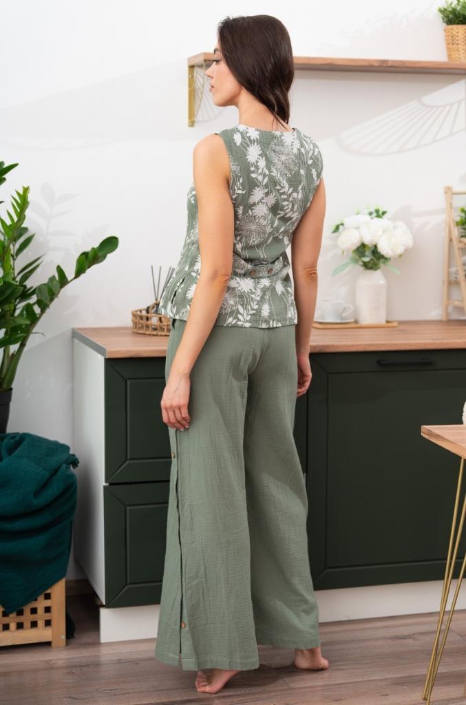 Комплект Mia-Amore выполнен из хлопкового муслина, состоит из принтованной блузки-жилета без рукавов с центральной застёжкой на пуговицы и однотонных брюк свободного силуэта. По боковому шву брюки имеют разрезы, которые застегиваются на декоративные пуговицы.