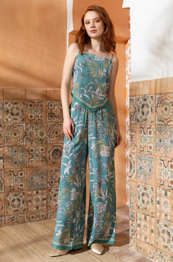 Комплект Mia-Amore состоит из топа на тонких бретелях с завязкой на спинке и брюк свободного силуэта, выполнен из принтованного вискозного полотна. Низ топа и брюк декорированы полосатым компаньоном.