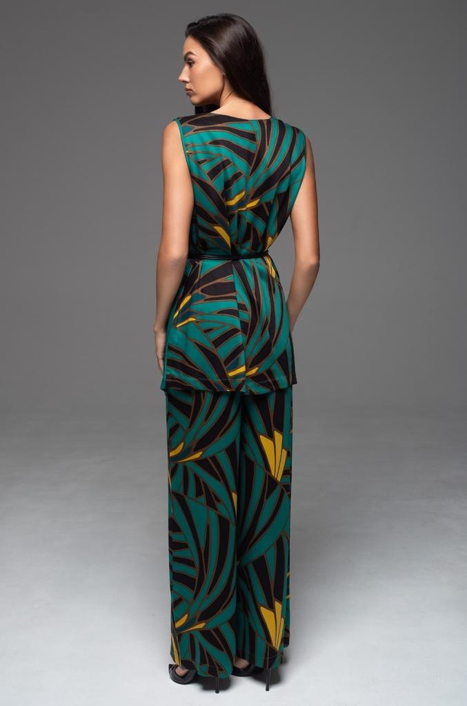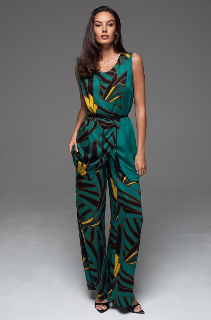 Комплект Mia-Amore состоит из запашного удлиненного топа на широких бретелях и брюк-палаццо. Топ выполнен из комбинации принтованного однотонного натурального материала, брюки полностью из принтованного. Линию талии можно подчеркнуть за счет стильного узкого пояса с кистями, который идет в комплекте.