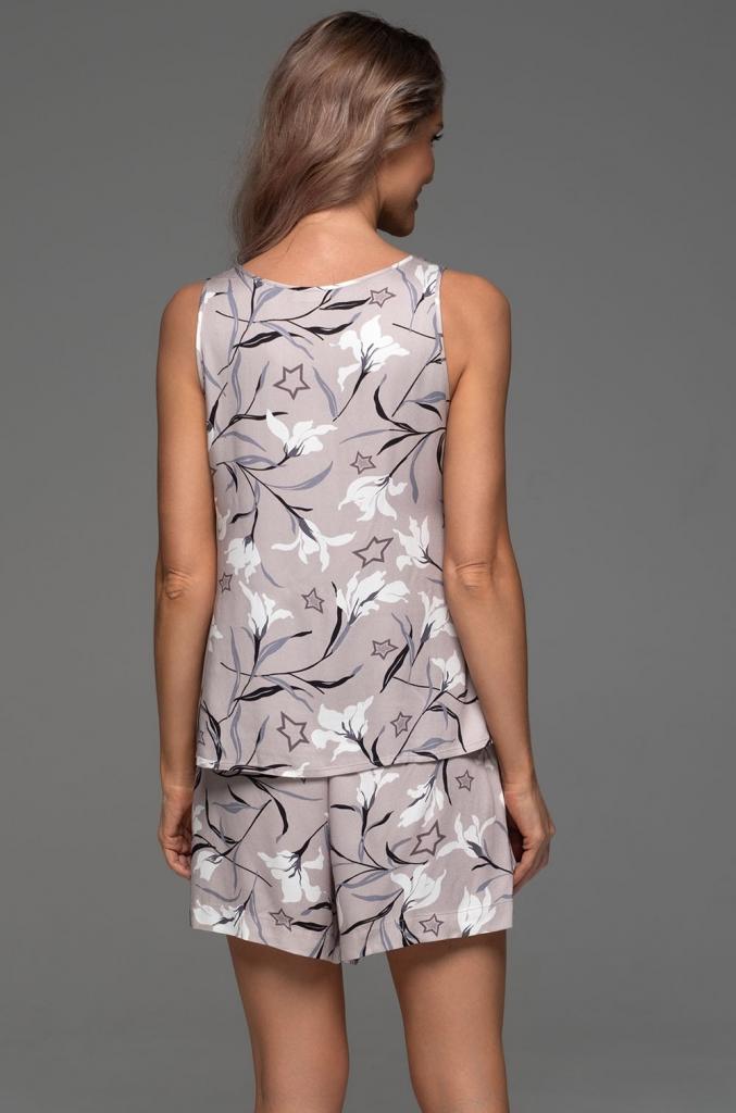 Комплект Mia-Amore состоит из топа маечного типа и шорт свободного силуэт на резинке, выполнен из смесового вискозного полотна. Горловина топа украшена планкой с пуговками. В шортах есть кармашки и разрезы про бокам.