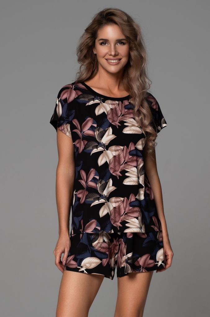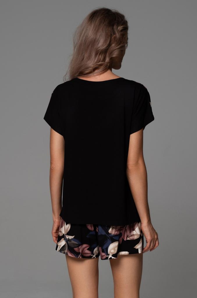 Комплект Mia-Amore состоит из свободного топа с коротким рукавом и шорт. Топ выполнен из принтованного трикотажного полотна с однотонной спинкой, шорты полностью принтованные.