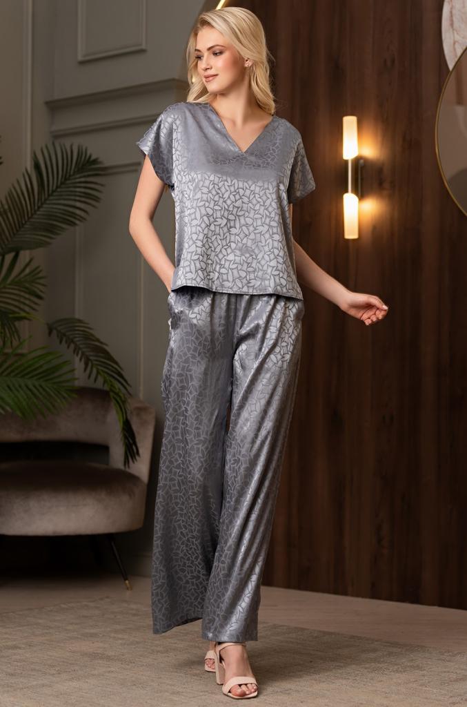Элегантный комплект Mia-Amore состоит из топа свободного силуэта и широких брюк. Данный сет выполнен из однотонного искусственного шелка на жаккардовой основе. В боковых швах брюк расположены карманы.