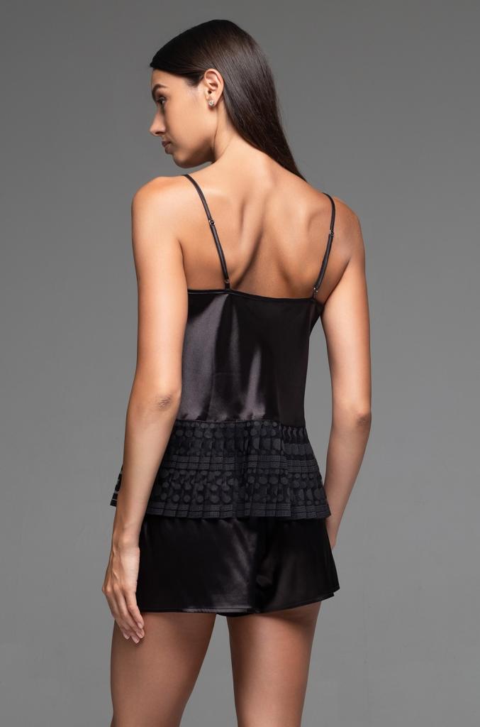 Комплект Mia-Amore состоит из топа на тонких бретелях и шорт. Топ выполнен из однотонного искусственного шелка с кружевными вставками по вырезу и с кружевной плиссированной оборкой по низу, шорты выполнены полностью из искусственного шелка. Декор - атласный бантик с подвеской по центру выреза топа.