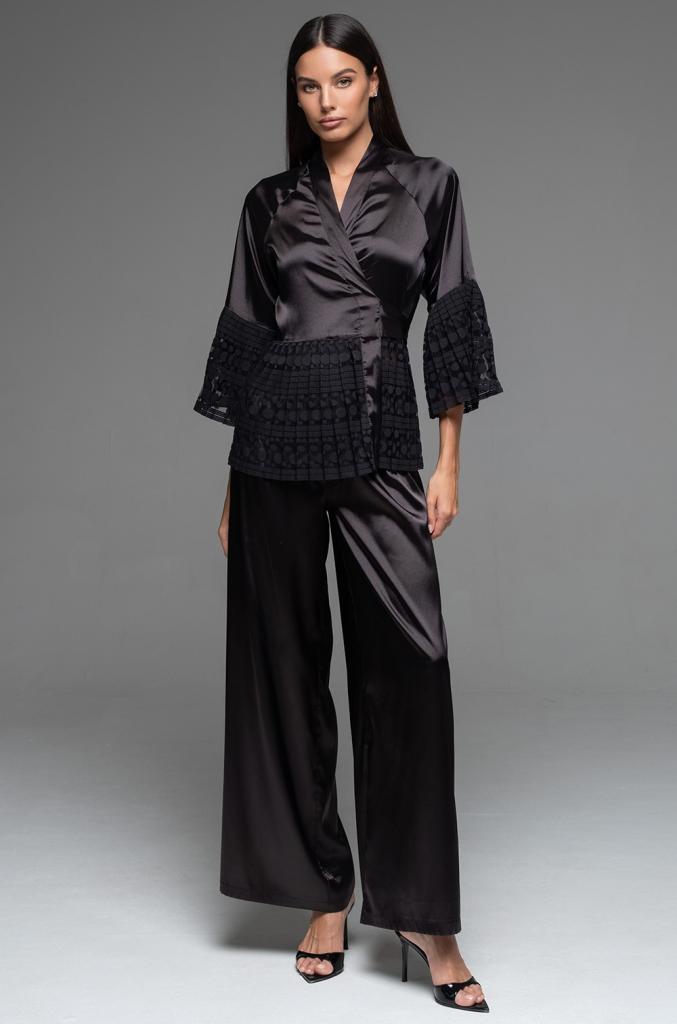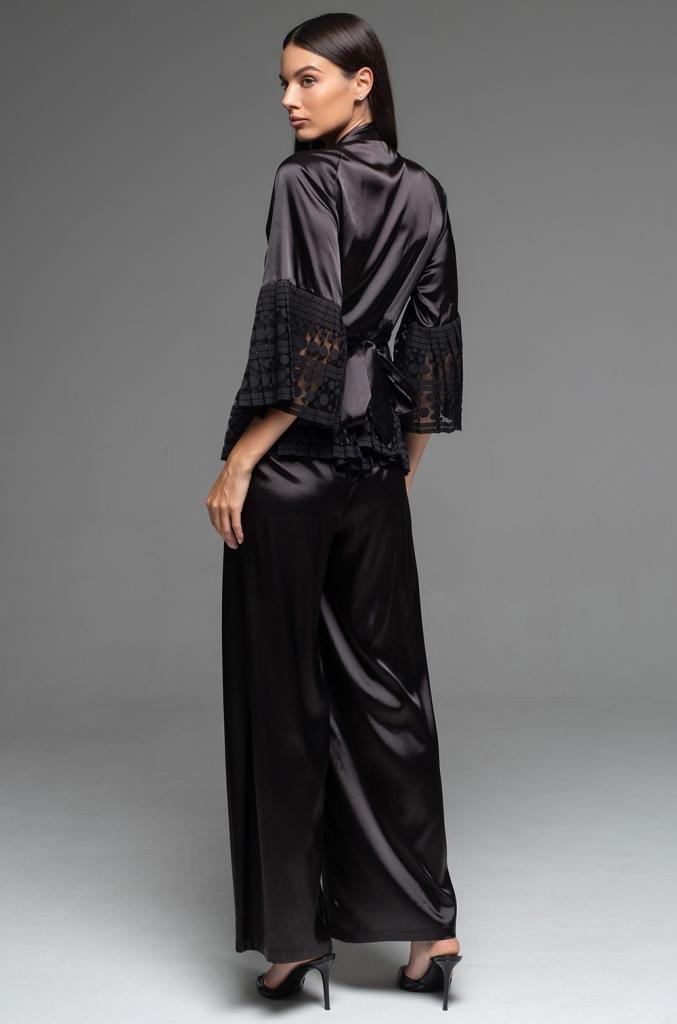 Элегантный комплект Mia-Amore состоит из запашного жакета и широких брюк палаццо. Изделия комплекта выполнены из однотонного искусственного шелка и дополнены плиссированными кружевными оборками по низу рукавов и низу жакета.