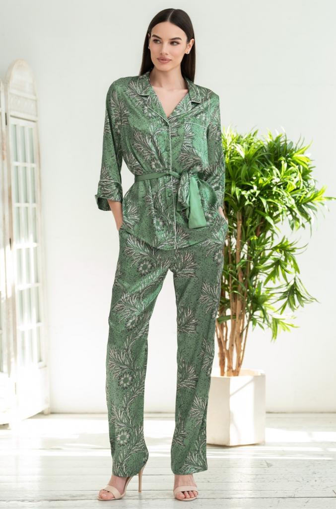 Брючный комплект Mia-Amore выполнен из искусственного принтованного шелка, состоит из жакета и брюк. Жакет на пуговицах, с рукавами длиной 7/8, на рукавах широкие притачные манжеты. Брюки длинные, с карманами в боковых швах, низ брюк с притачными широкими манжетами. Жакет и брюки декорированы отделкой в виде канта. Комплект дополнен поясом.