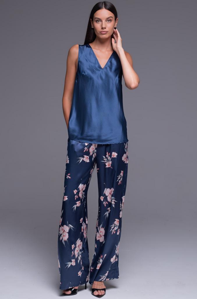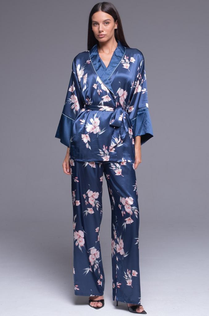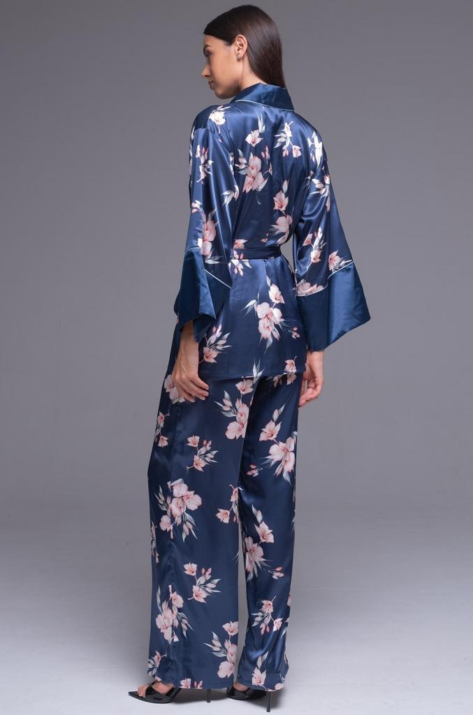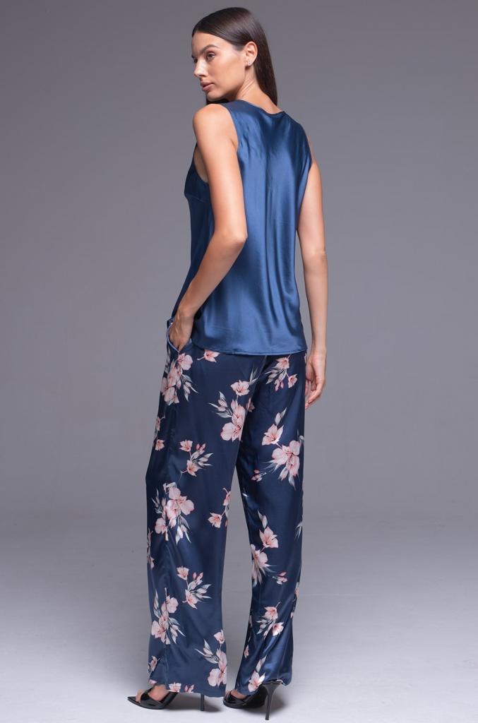 Комплект-тройка Mia-Amore состоит из топа, брюк и запашного жакета. Брюки и жакет выполнены из принтованного искусственного шёлка. Однотонный топ на широких бретелях V-образная горловина спереди декорирована бантиком с подвеской. Брюки с эластичным поясом и с боковыми карманами. Запашной жакет с рукавами длиной ¾, которые по низу отделаны однотонным атласом в тон и контрастным кантом, воротник декорирован однотонной отделкой с кантом. Жакет комплектуется широким поясом.