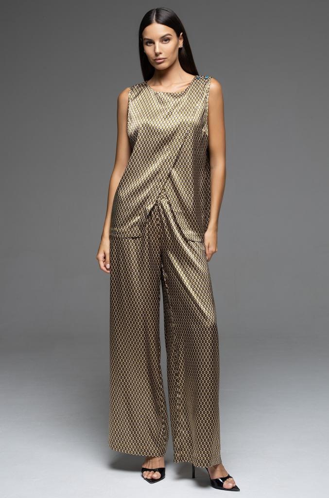 Комплект Mia-Mella состоит из запашного топа свободного силуэта и широких брюк палаццо. Универсальность комплекта позволяет его носить не только дома, но использовать для дневных выходов. Изделия комплекта выполнены из искусственного принтованного шелка.