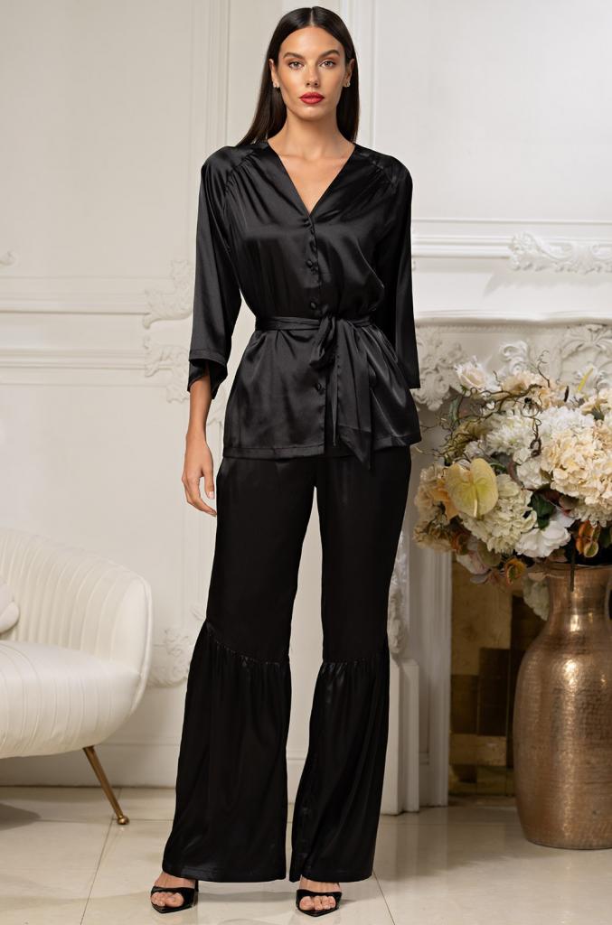 Комплект-двойка Mia-Amore из однотонного искусственного шелка, состоит из жакета на пуговицах с V-образным вырезом и брюк. Брючины декорированы оригинальными оборками. В боковых швах брюк обработаны карманы.