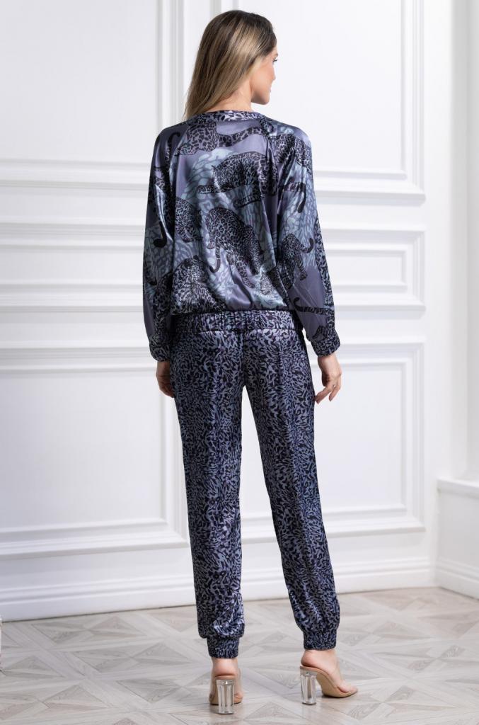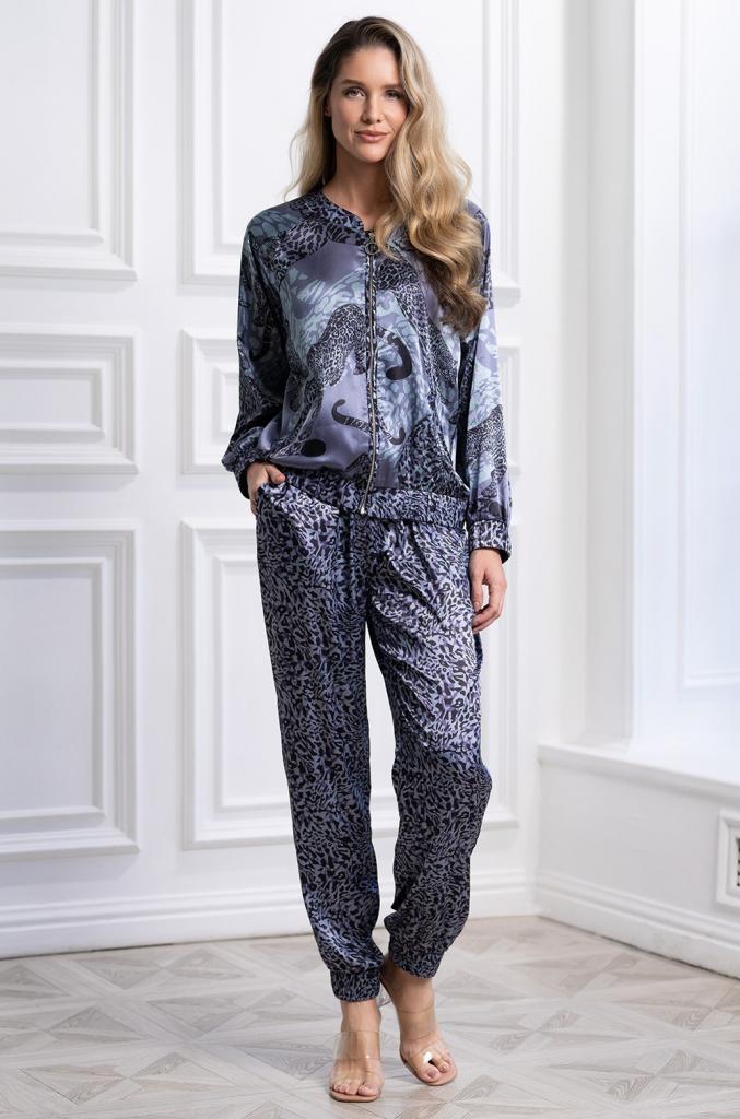 Комплект Mia-Amore состоит из бомбера на молнии и брюк с манжетами на резинке по низу. Бомбер выполнен из принтованного смесового шелка с отделкой анималистичным компаньоном, брюки из смесового шелка - компаньона. По бокам брюк обработаны карманы.