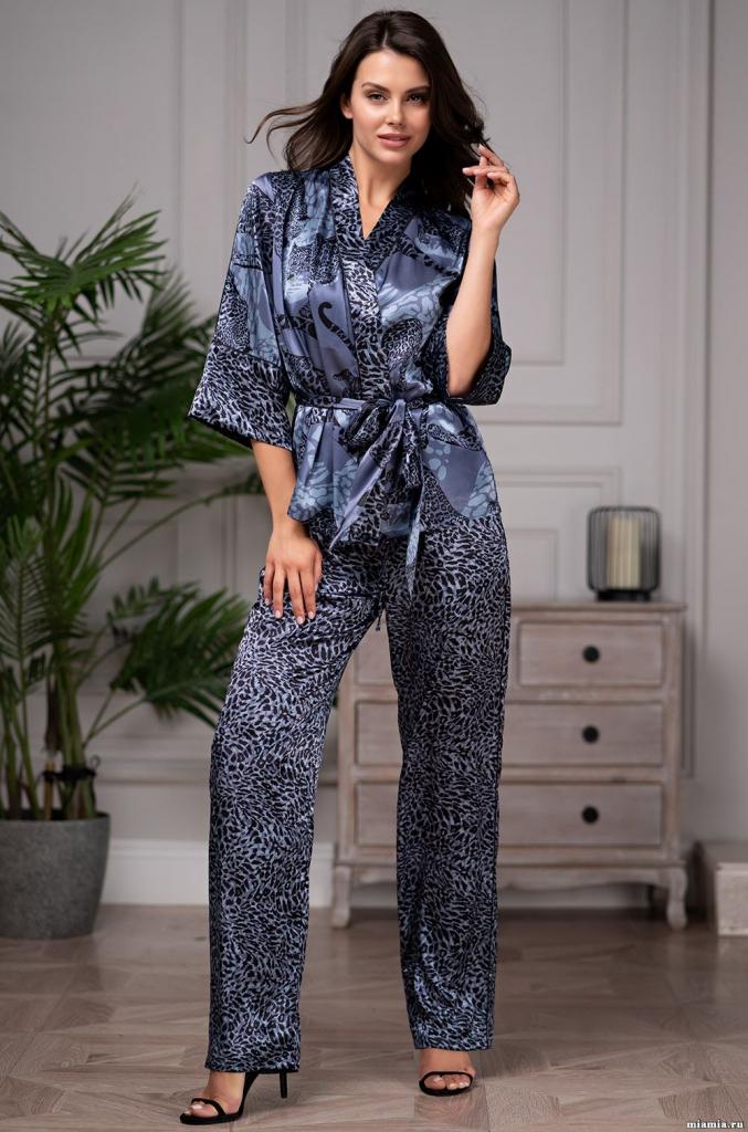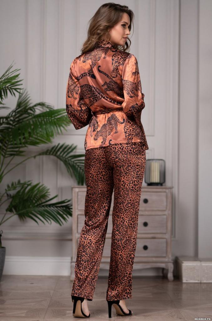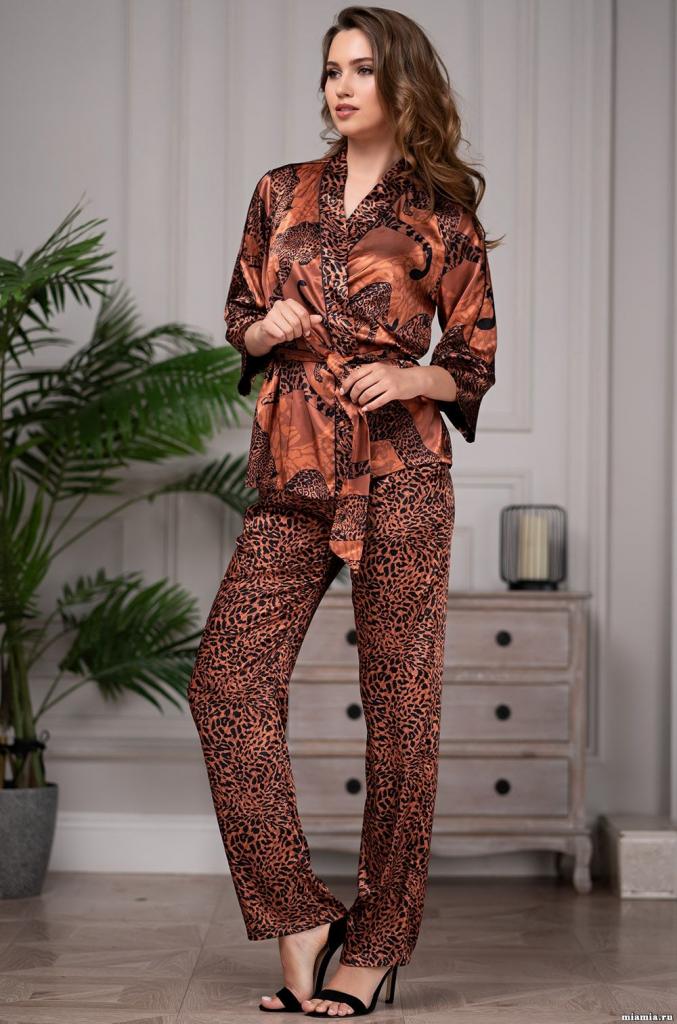 Комплект Mia-Amore состоит из жакета, топа и брюк. Изделия комплекта выполнены из принтованного смесового шелка с отделкой анималистичным компаньоном. Брюки и топ выполнены из мелкоузорчатого минималистичного принта, жакет – из крупного анималистичного принта. Планка и манжеты обработаны тканью-компаньоном. Отделка в виде контрастного канта по краям борта, манжетам и боковым швам брюк. По бокам брюк обработаны карманы.