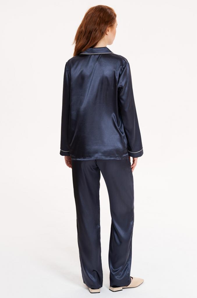 Комплект Mia-Mella состоит из жакета с центральной застежкой на пуговицыи длинными рукавами и брюк. Комплект выполнен из искусственного шелкового полотна с атласным блеском. Рукава, борт, карманы жакета и низ брюк декорированы контрастным кантом.