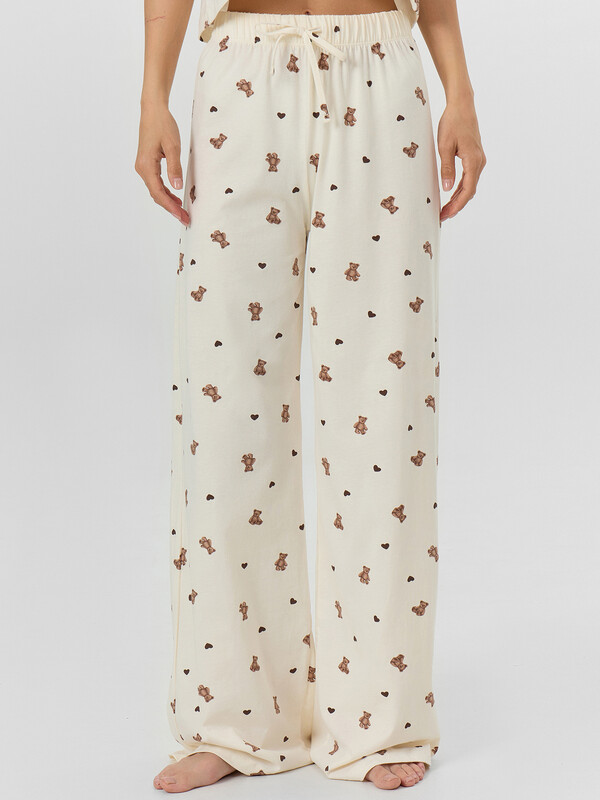 Брюки сидят на естественной линии талии. Внутри пояса вшита мягкая резинка, которая надежно держит изделие, не сдавливая живот. Специальная бейка-завязка позволяет регулировать плотность посадки. Широкие штанины не стесняют движений, а ровные швы по низу сохраняют форму после стирок.