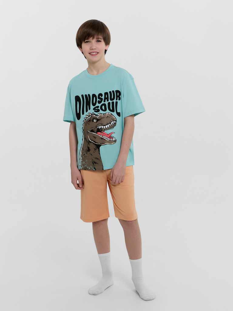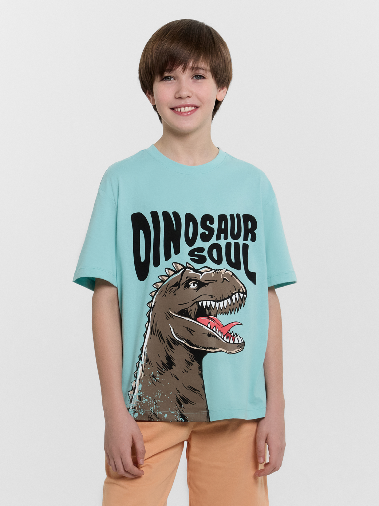 Футболка свободного силуэта. Горловина круглой формы, обтачка из ребаны. Рукава втачные свободные, линия плеча слегка спущена. Низ рукавов и футболки в подгибку.
