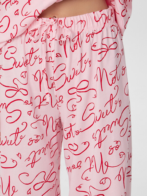 Брюки с эластичной резинкой мягко сидят по талии, не сковывая движений. Оригинальный пояс с протянутой декоративной тесьмой добавляет модели изюминку, а аккуратно обработанные низы сохраняют форму изделия. Этот комплект станет верным спутником для сна, отдыха и домашних дел. В нем гармонично сочетаются практичность, уют и привлекательный внешний вид, делая каждую минуту в доме по-настоящему комфортной.