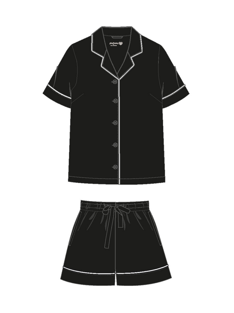 Женская пижама. Рубашка с коротким рукавом и шорты из 100% вискозы. Рубашка с застежкой на пуговицы. Шорты на резинке со шнурком. Функциональные боковые карманы.