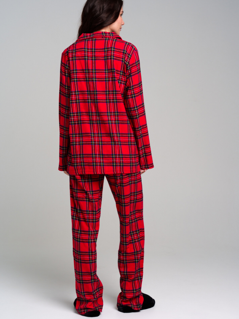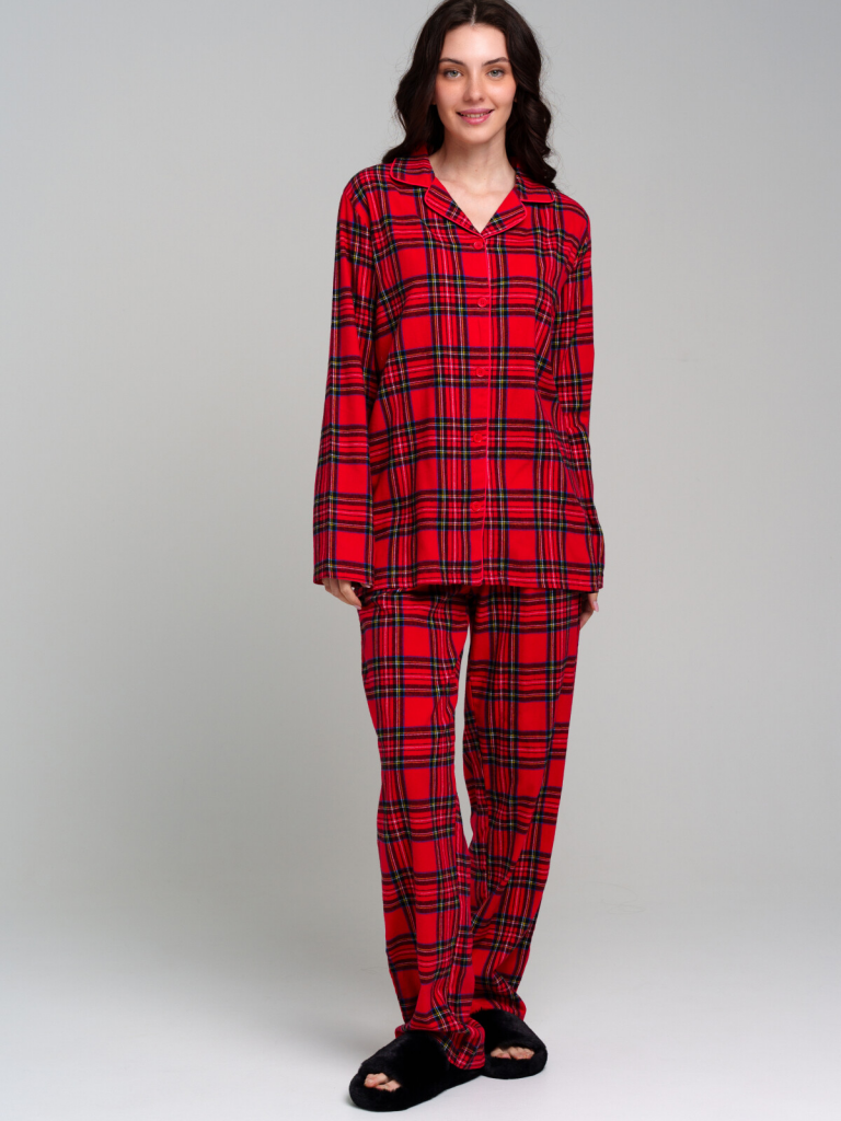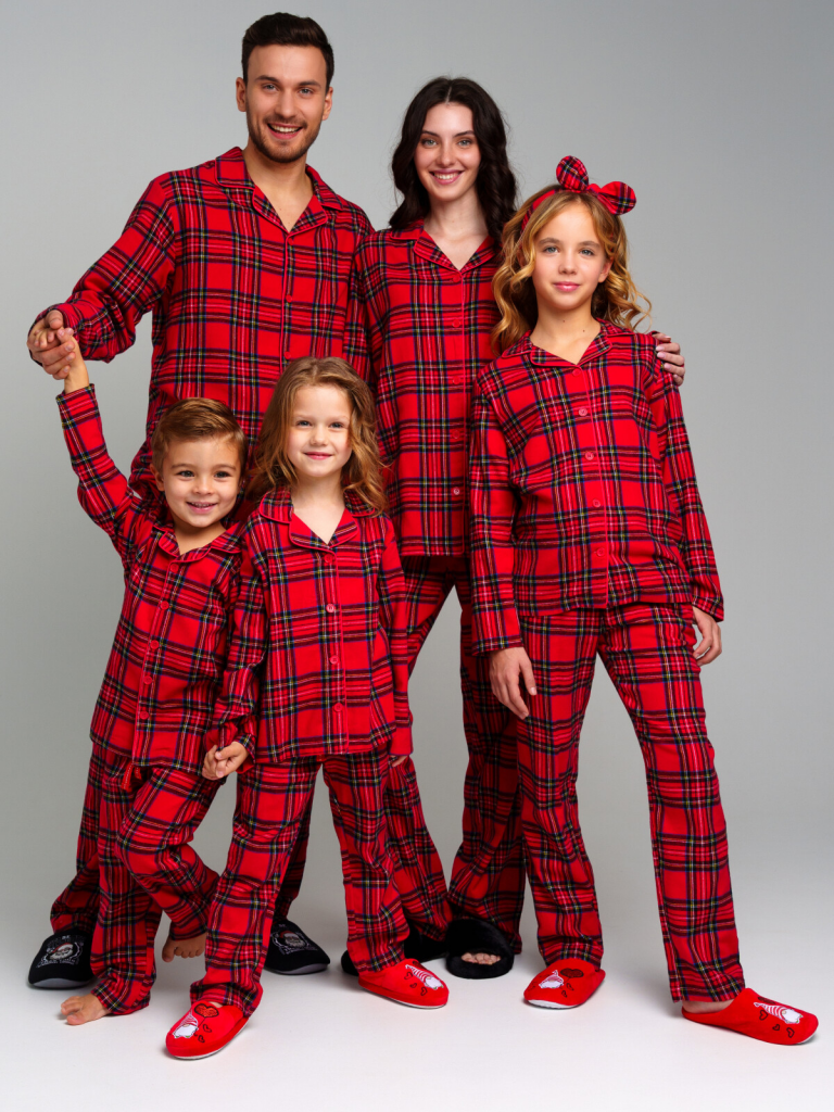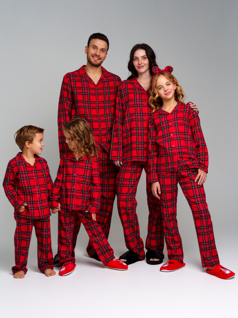 Пижама текстильная взрослых размеров: можно составить family look c детским вариантом пижамы аналогичного дизайна. 100% хлопок. Фланель - мягкая, приятная к телу ткань с небольшим начесом. Застежка на пуговицы. Карманы в брюках. Эластичный пояс с тесьмой позволяет легко надевать брюки и утягивать до комфортной посадки.