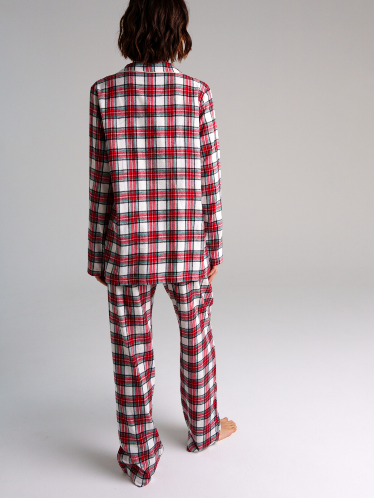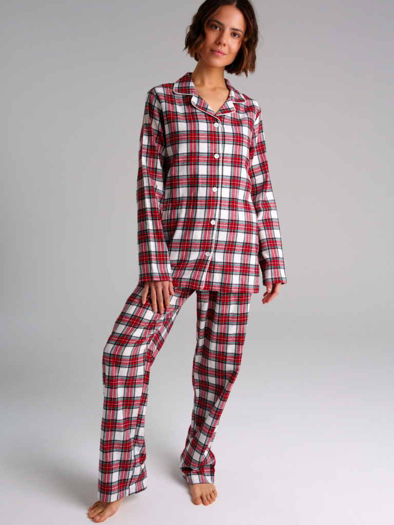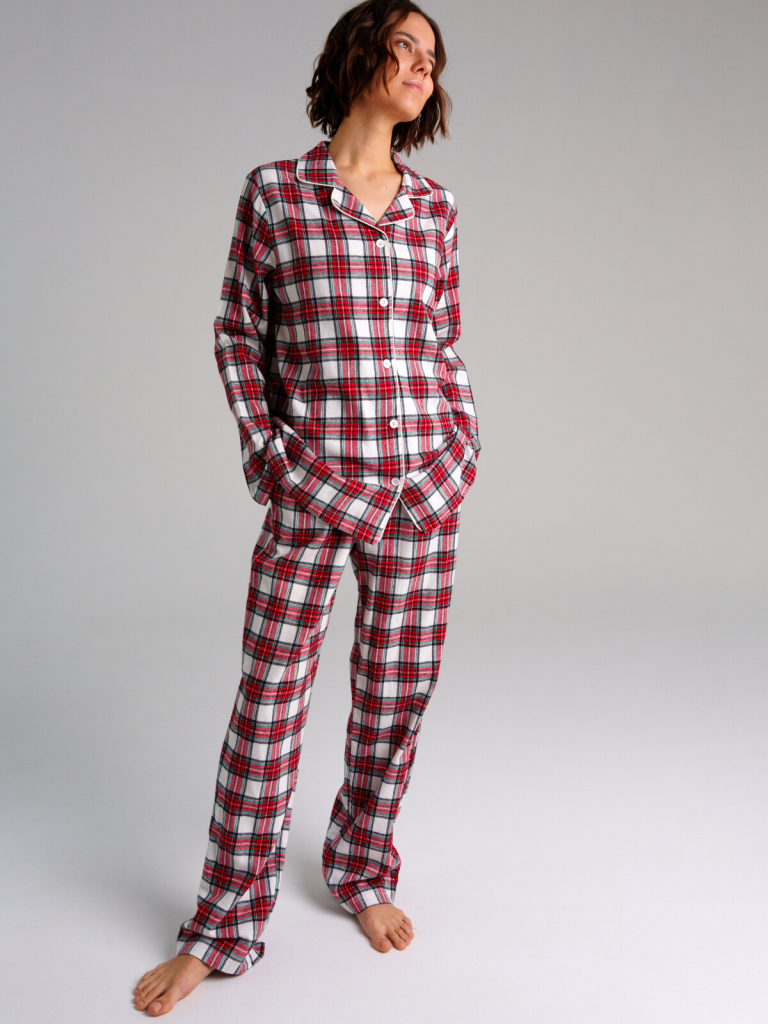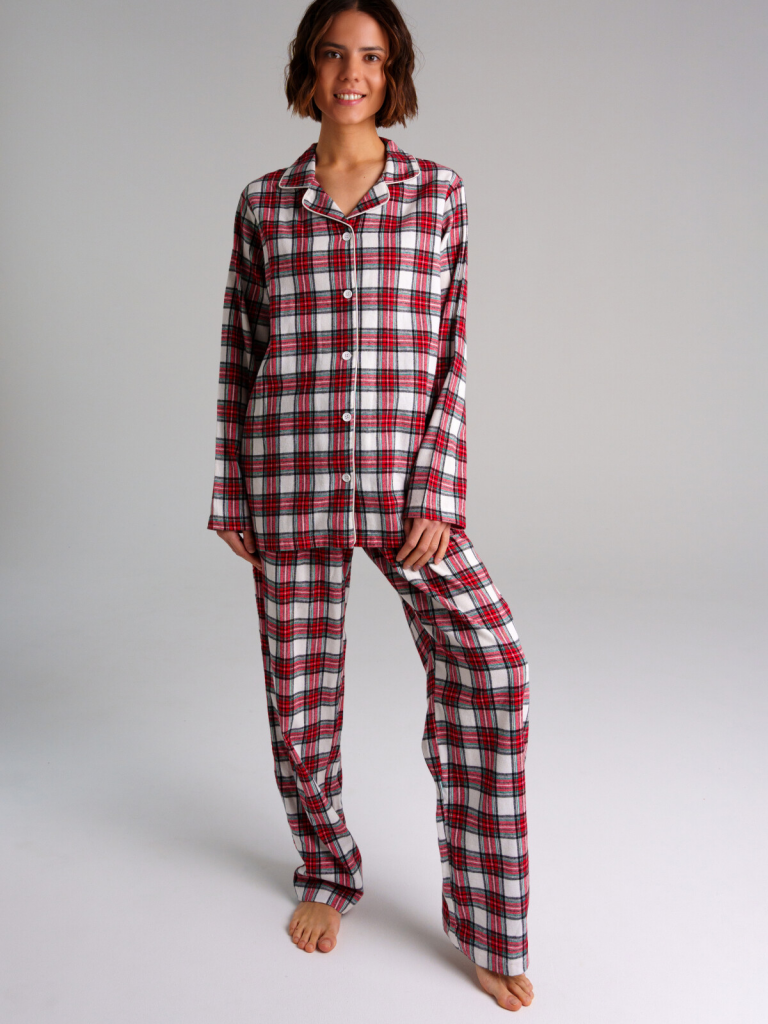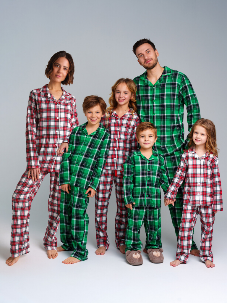 Пижама текстильная взрослых размеров: можно составить family look c детским вариантом пижамы аналогичного дизайна. 100% хлопок. Фланель - мягкая, приятная к телу ткань с небольшим начесом. Застежка на пуговицы. Карманы в брюках. Эластичный пояс с тесьмой позволяет легко надевать брюки и утягивать до комфортной посадки.