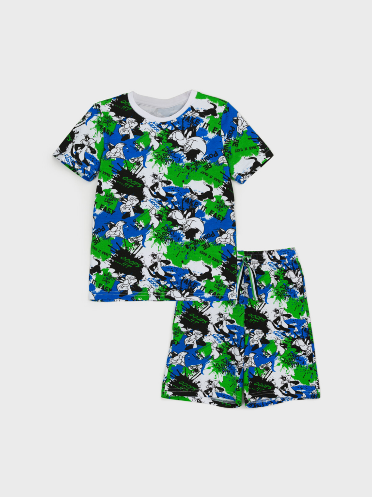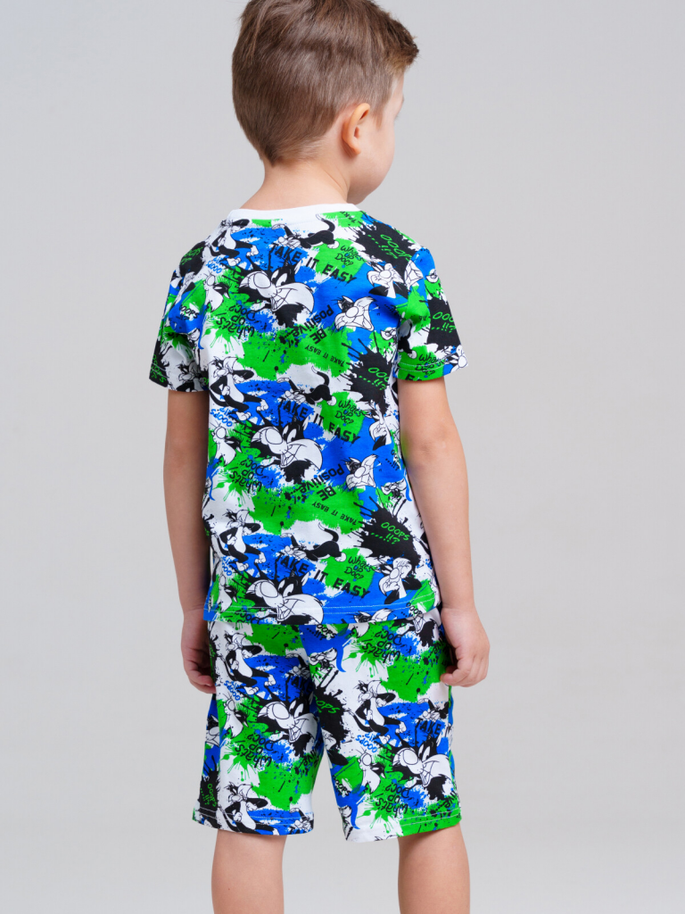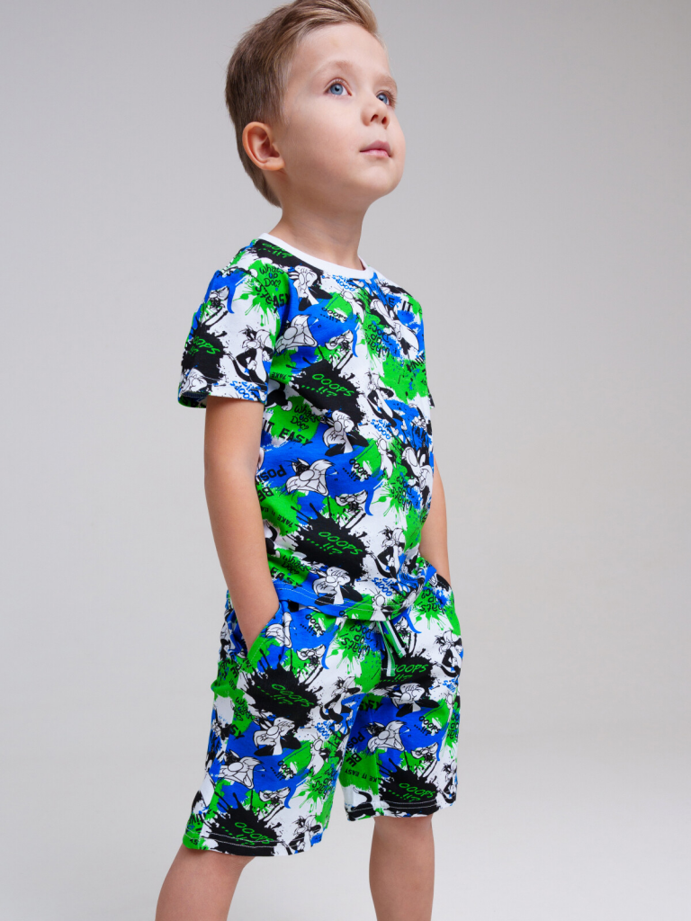 Пижама детская для мальчика. Футболка и шорты из эластичного и приятного на ощупь трикотажа. Шорты на резинке со шнурком. Шорты с карманами в боковых швах. Высокое содержание хлопка 95%. Благодаря наличию эластана в составе ткани изделие держит форму и меньше мнется.