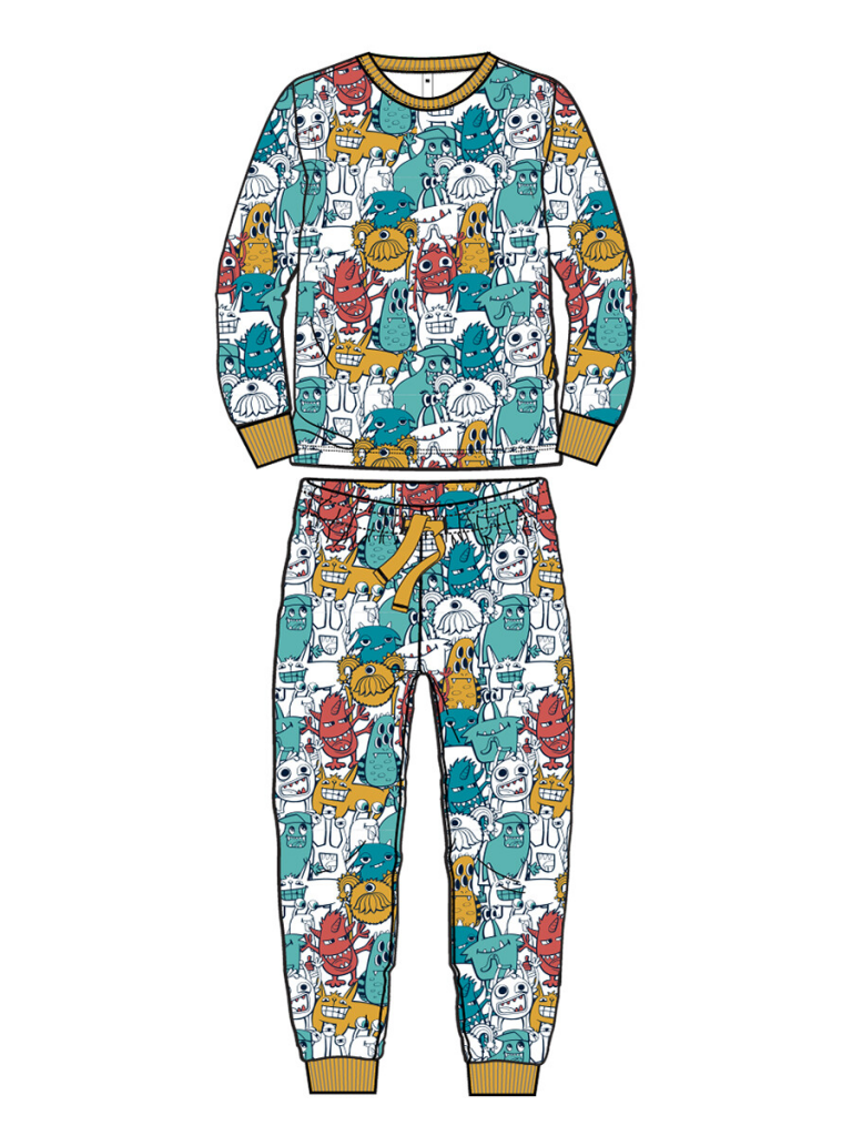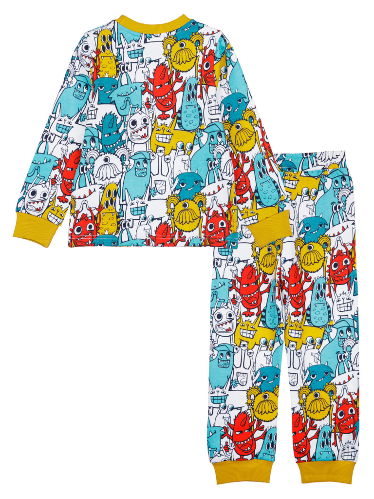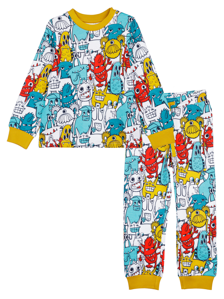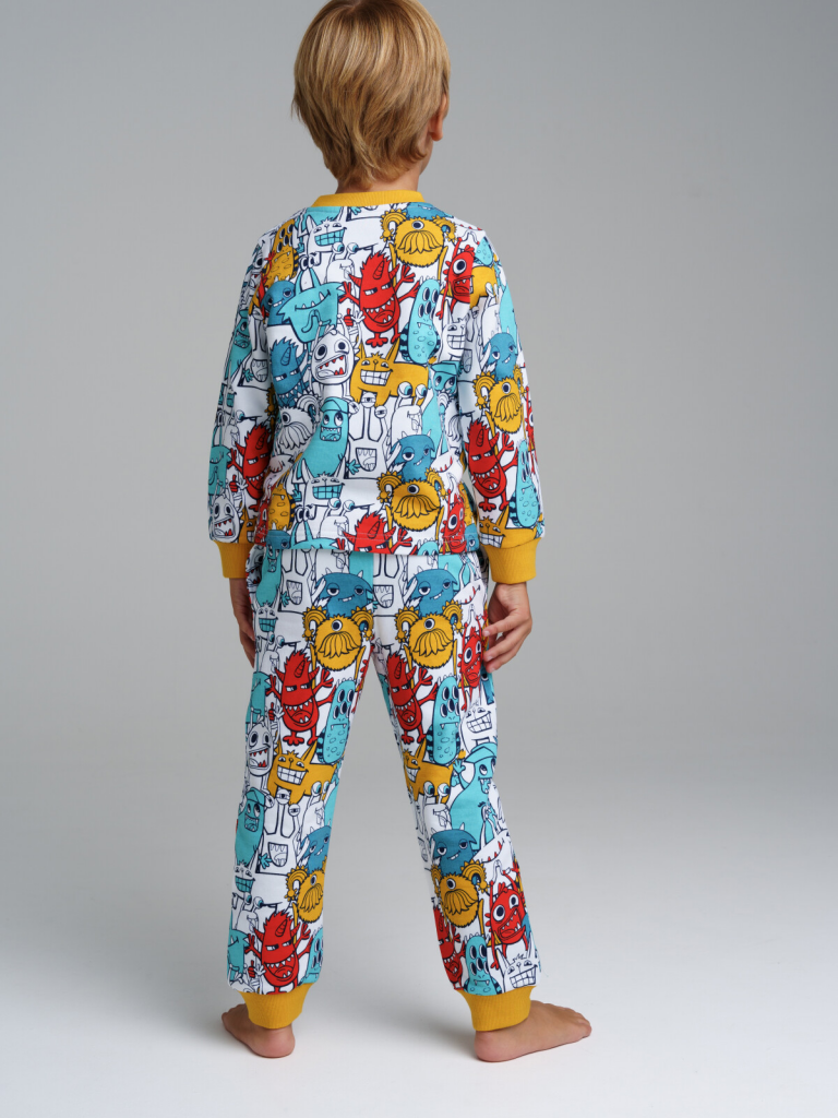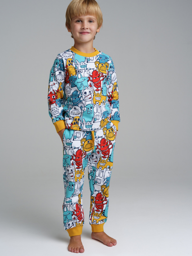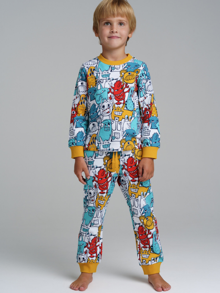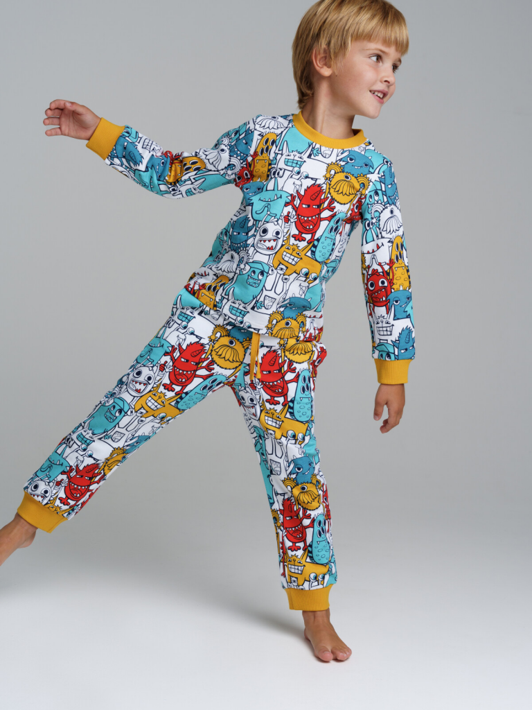 Пижама: свитшот и брюки из трикотажа. 100% хлопок. На брюках эластичный пояс со шнурком. Эластичные манжеты по рукавам и низу брюк.