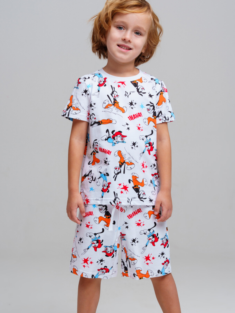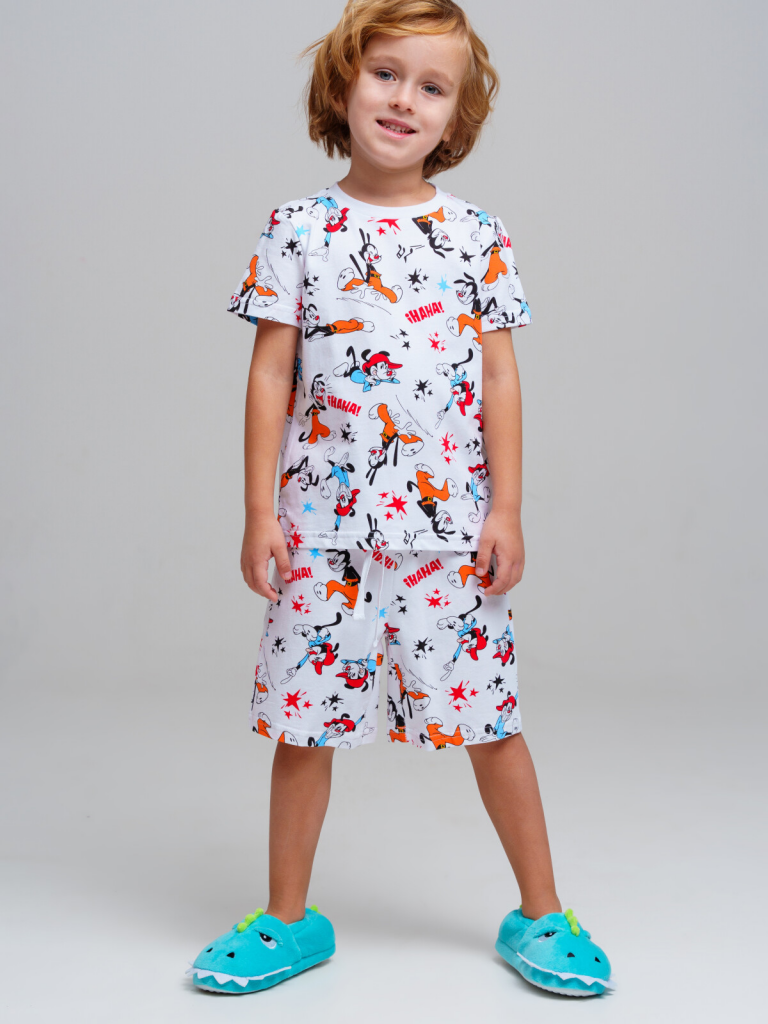 Пижама детская для мальчика. Футболка и шорты из эластичного и приятного на ощупь трикотажа. Шорты на резинке со шнурком. Высокое содержание хлопка 95%. Благодаря наличию эластана в составе ткани изделие держит форму и меньше мнется.