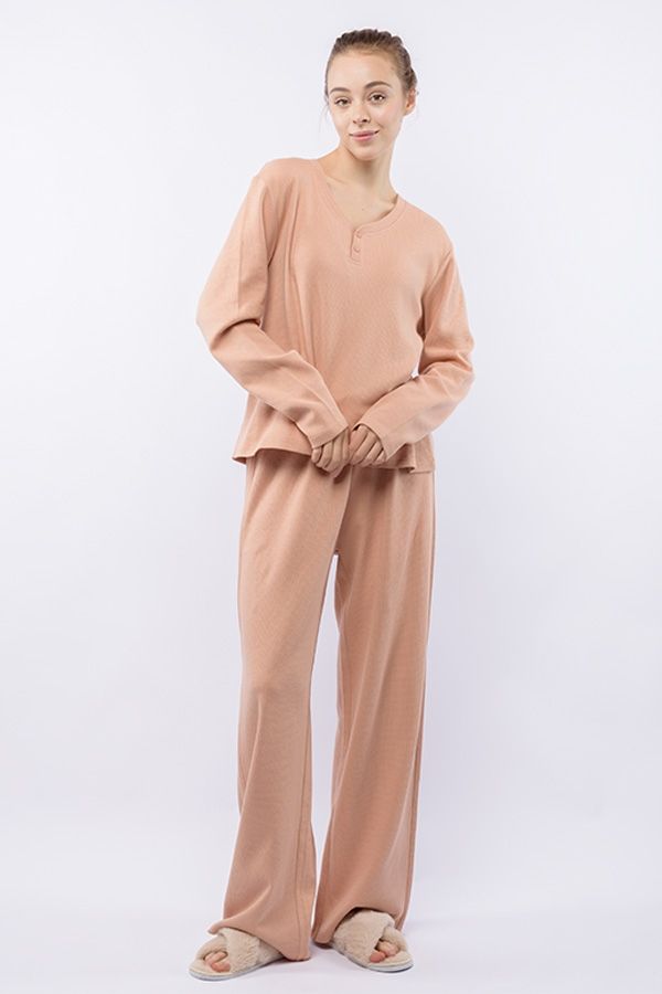 Домашний костюм OVERSIZE из эластичного вафельного трикотажа розово-бежевого цвета состоит из лонгслива и широких брюк. Лонгслив с V-образным вырезом с 2 пуговицами, отделка горловины из материала изделия. Рукав длинный без манжет, подгиб и плоский шов по запястью и низу изделия. Брюки на широкой резинке со шнурком. Подгиб и плоский шов по низу брюк. XS-XS(170-84-90), S-S(170-88-94), M-M(170-92-98), L-L(170-96-102), XL-XL(170-100-106)