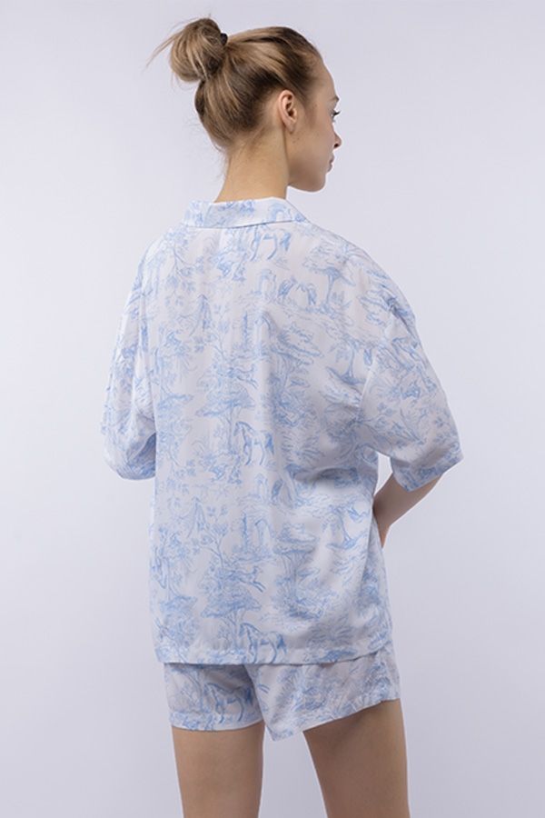 Домашний костюм из тканой вискозы состоит из рубашки и шорт. Принт : «Туаль де Жуи» (Toile de Jouy) — это французская ткань с одноцветным рисунком в синих тонах на светлом фоне, изображающим пасторальные сцены, пейзажи или сцены из жизни XVIII века. Рубашка с английским воротником, на пуговицах, с коротким рукавом. Короткие шорты на резинке. Подгиб и строчка по низу рукава и рубашки и низу брюк. XS-XS(170-84-90), S-S(170-88-94), M-M(170-92-98), L-L(170-96-102), XL-XL(170-100-106)